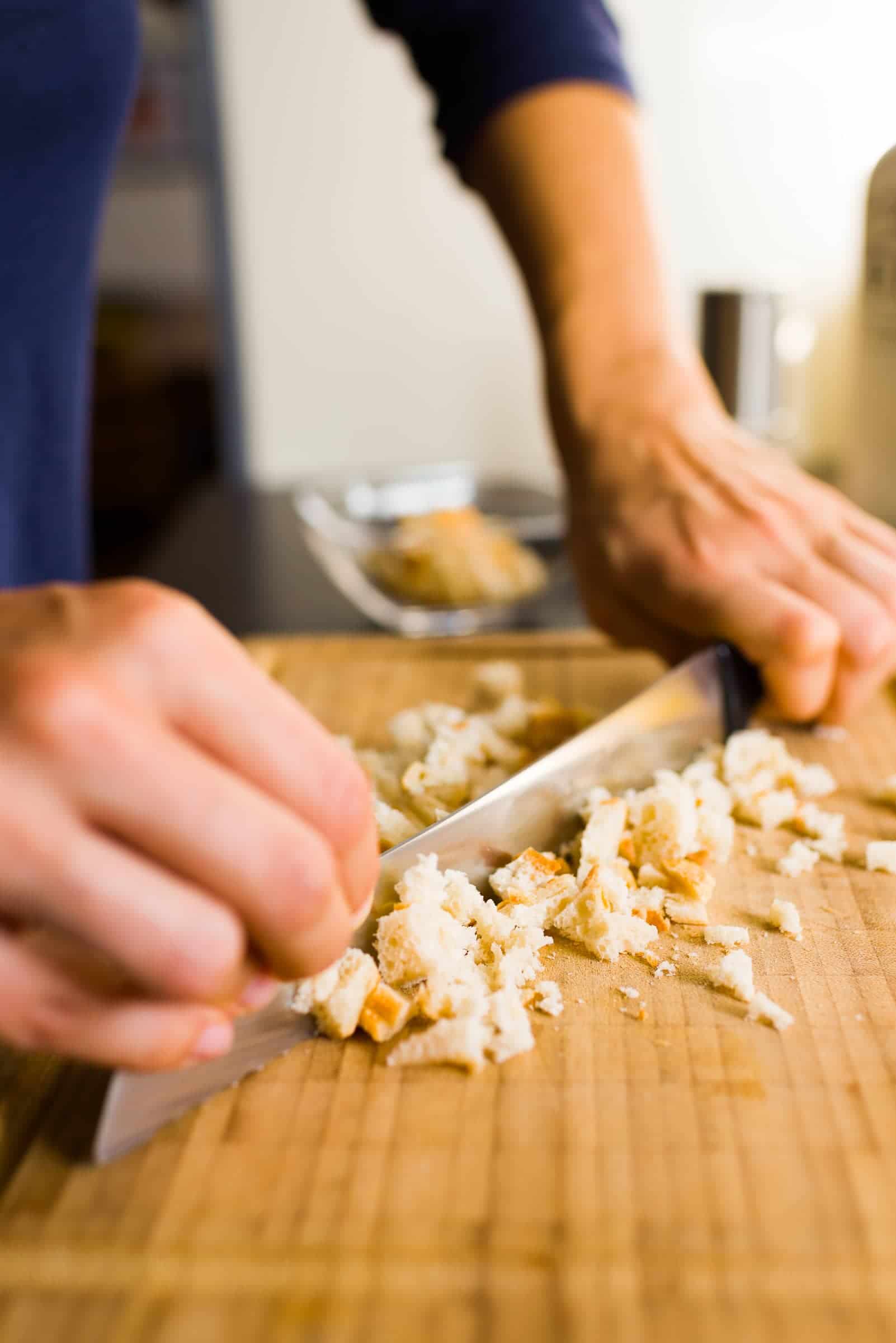 Tagliate il panino al coltello ottenendo pezzettini molto piccoli per formare una grana grossolana. Adagiate le molliche di pane in una ciotola per facilitare i prossimi passaggi.