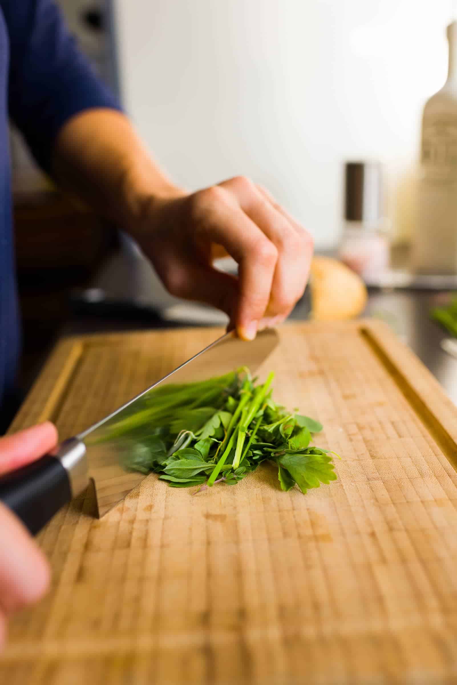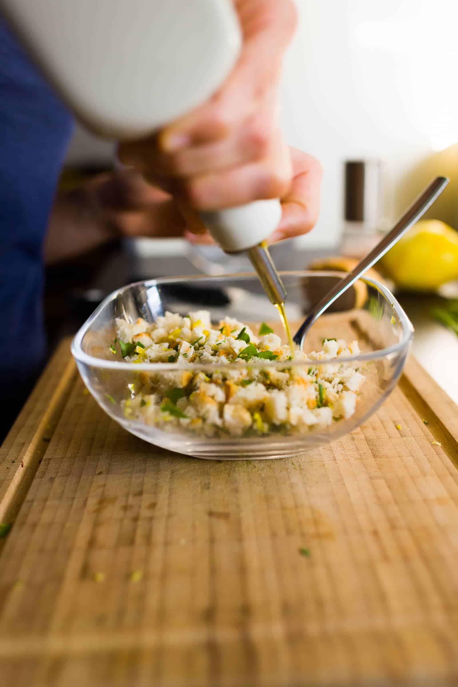 Tritate le erbe aromatiche scelte a vostro piacere. In seguito procedete di nuovo al coltello e poi aggiungete il trito di erbe alle molliche di pane insieme alla buccia grattugiata del limone.