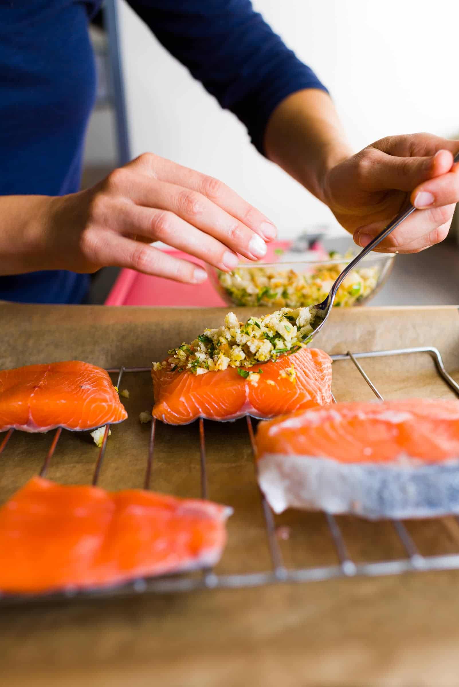Farcite la superficie del salmone con le molliche aromatizzate.