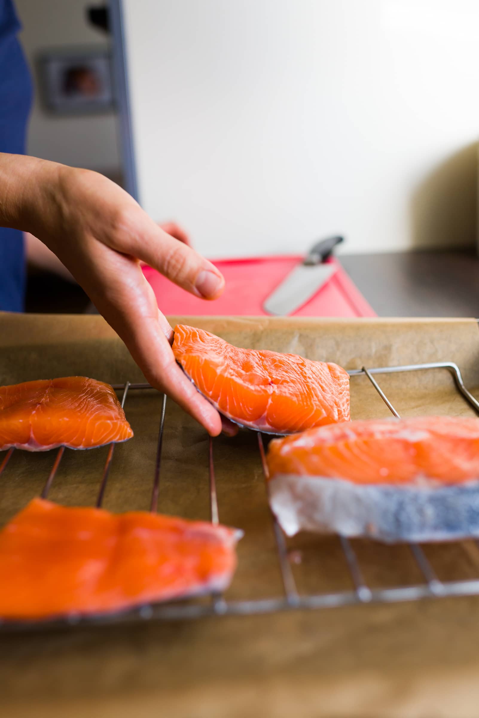 Suddividete il filetto di salmone tagliandolo in tranci. Adagiatelo su di una griglia da forno, messa a sua volta al di sopra di una teglia, in modo che la teglia raccolga il grasso in eccesso che gocciolerà attraverso la griglia durante la cottura.