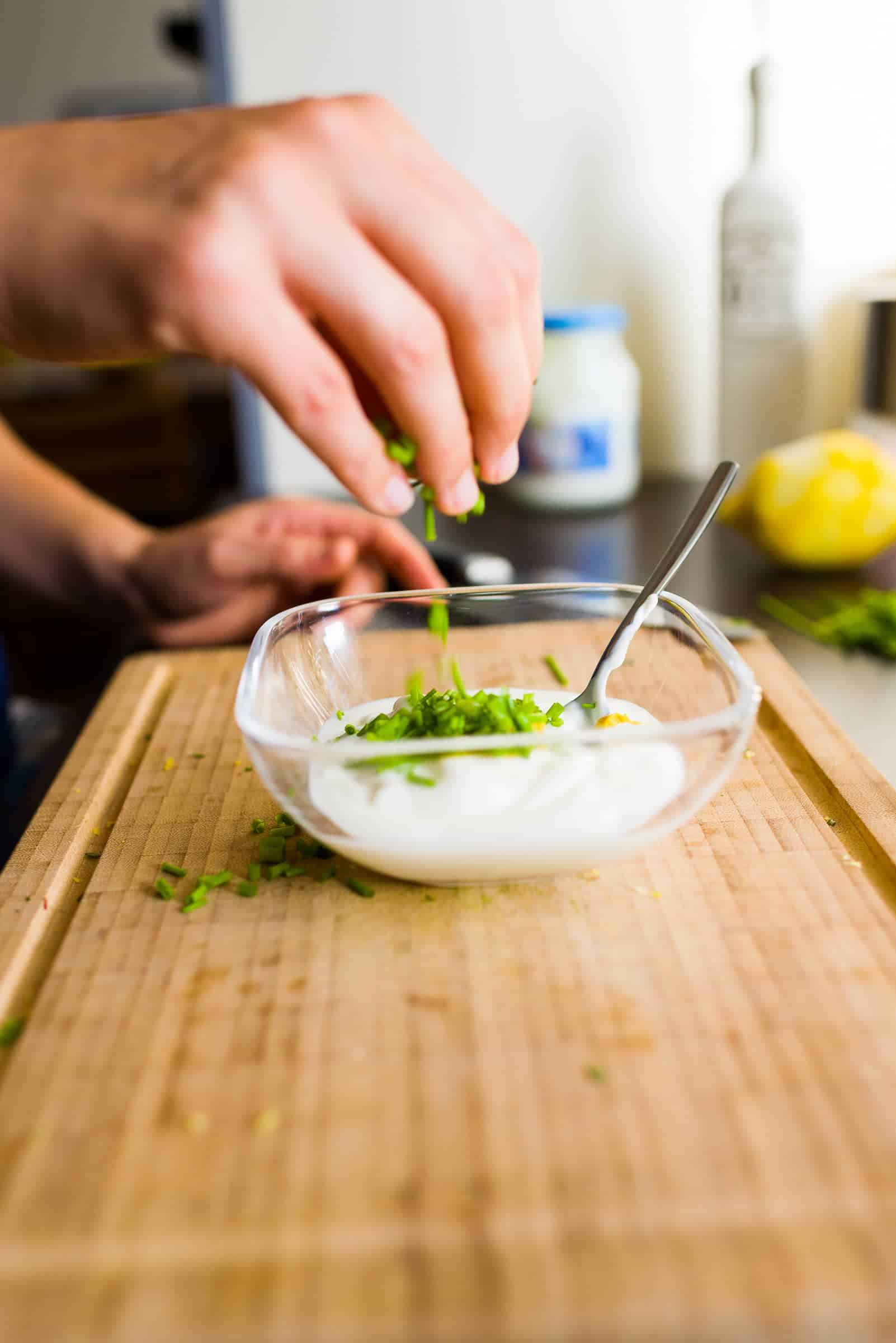 Mettete in una ciotola lo yogurt, il cucchiaino di senape e l’erba cipollina. Mescolate il tutto e voilà la salsa è pronta