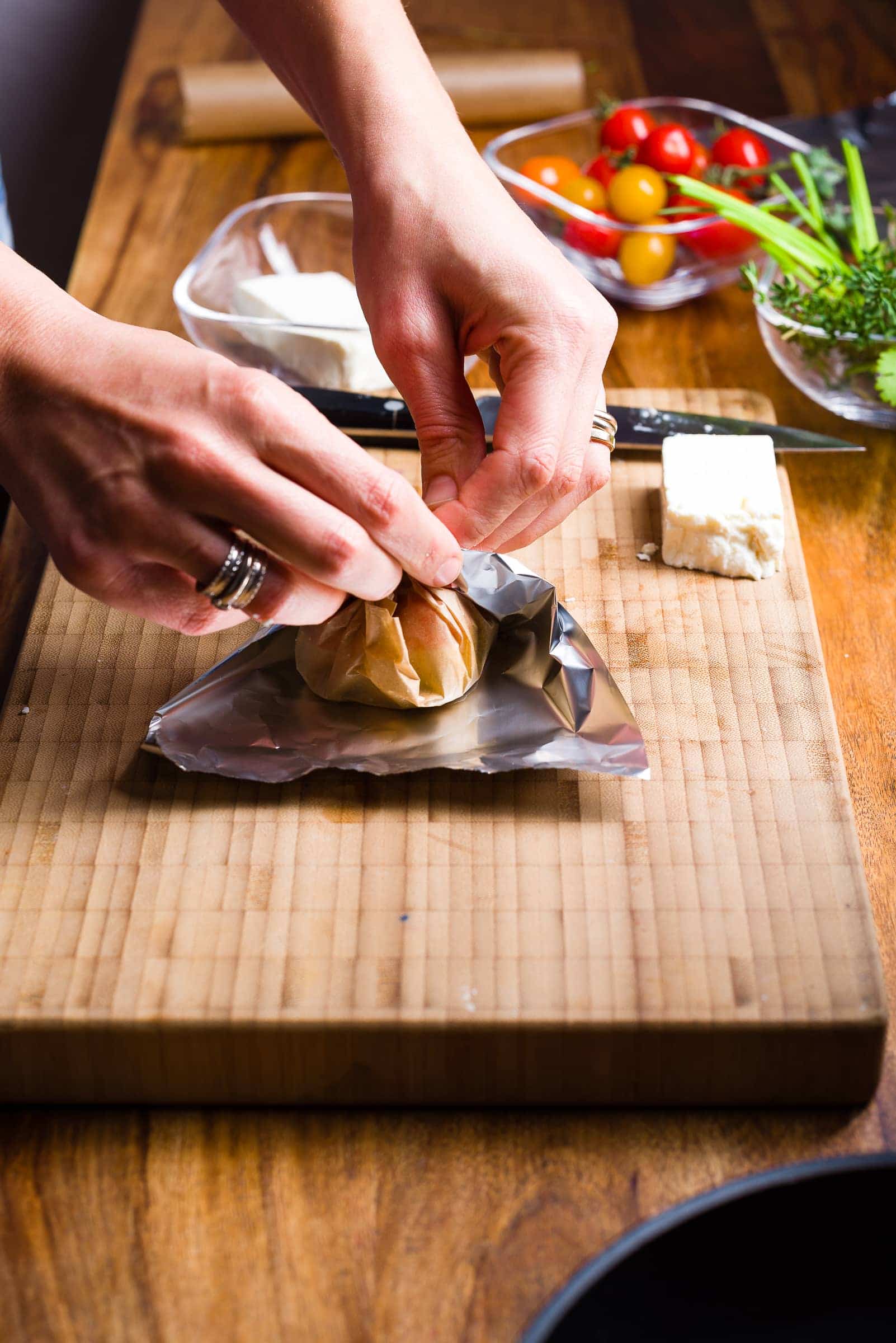 Richiudete a cartoccio la carta forno avvolgendo bene la feta e finalmente incartate il tutto con il foglio di alluminio.
