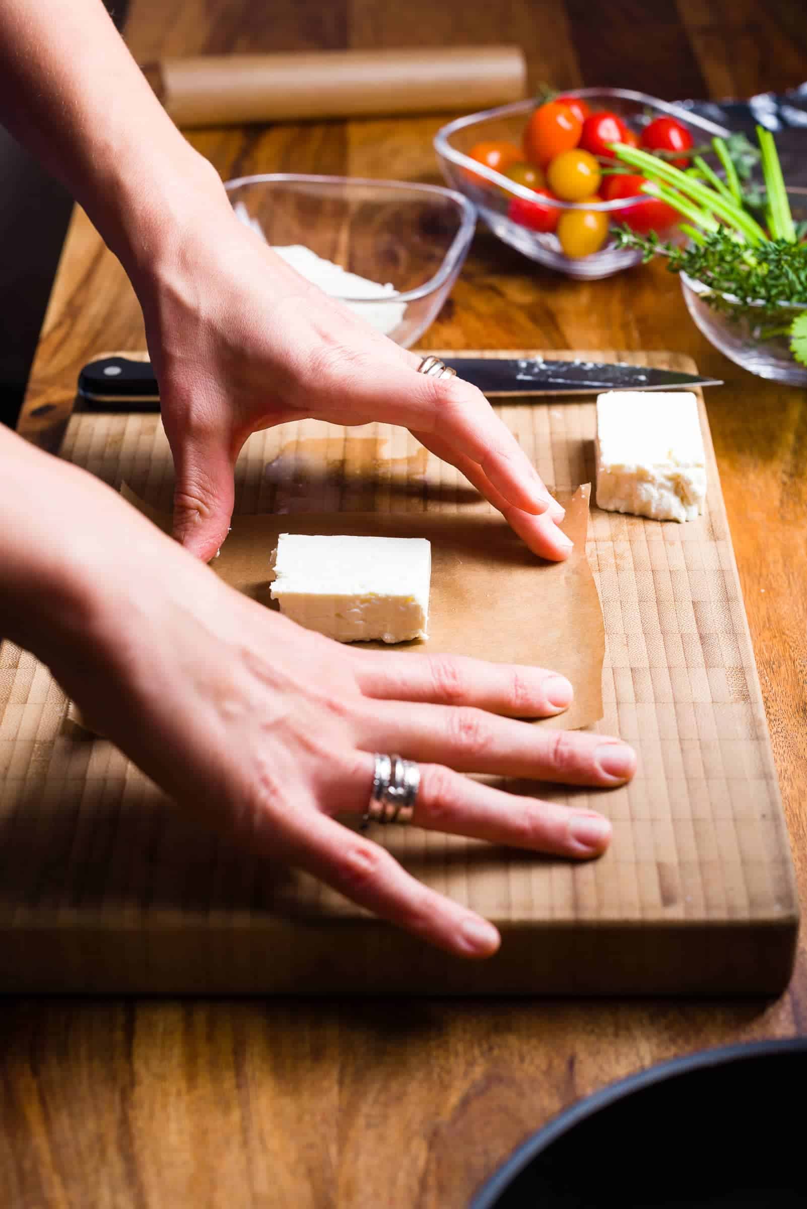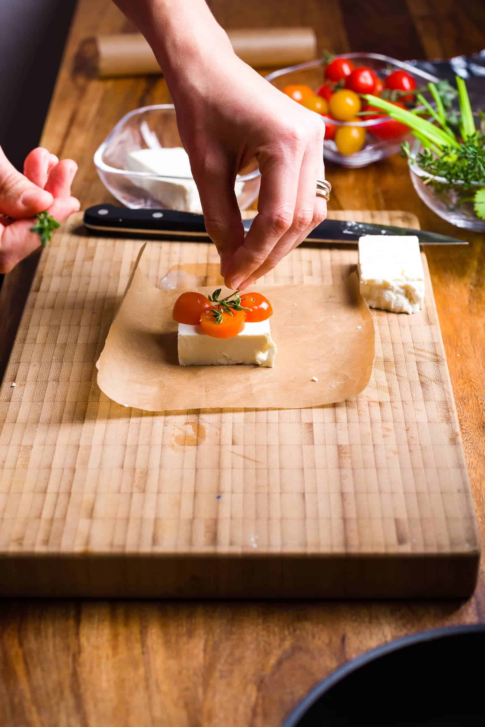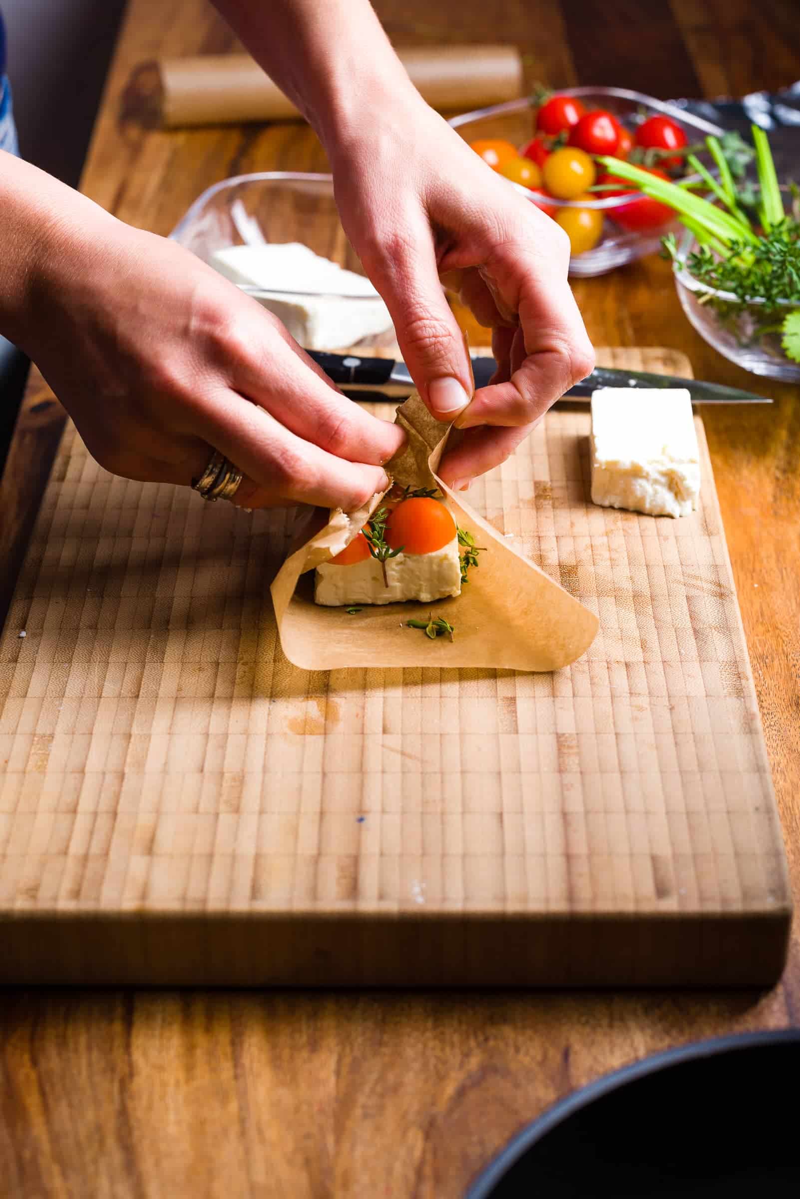 Tagliate la mattonella di feta in 4 rettangoli. Accoppiate ogni rettangolo di feta ad un quadrato di carta forno adagiando il formaggio sulla carta. Procedete come segue con ogni singola porzione.