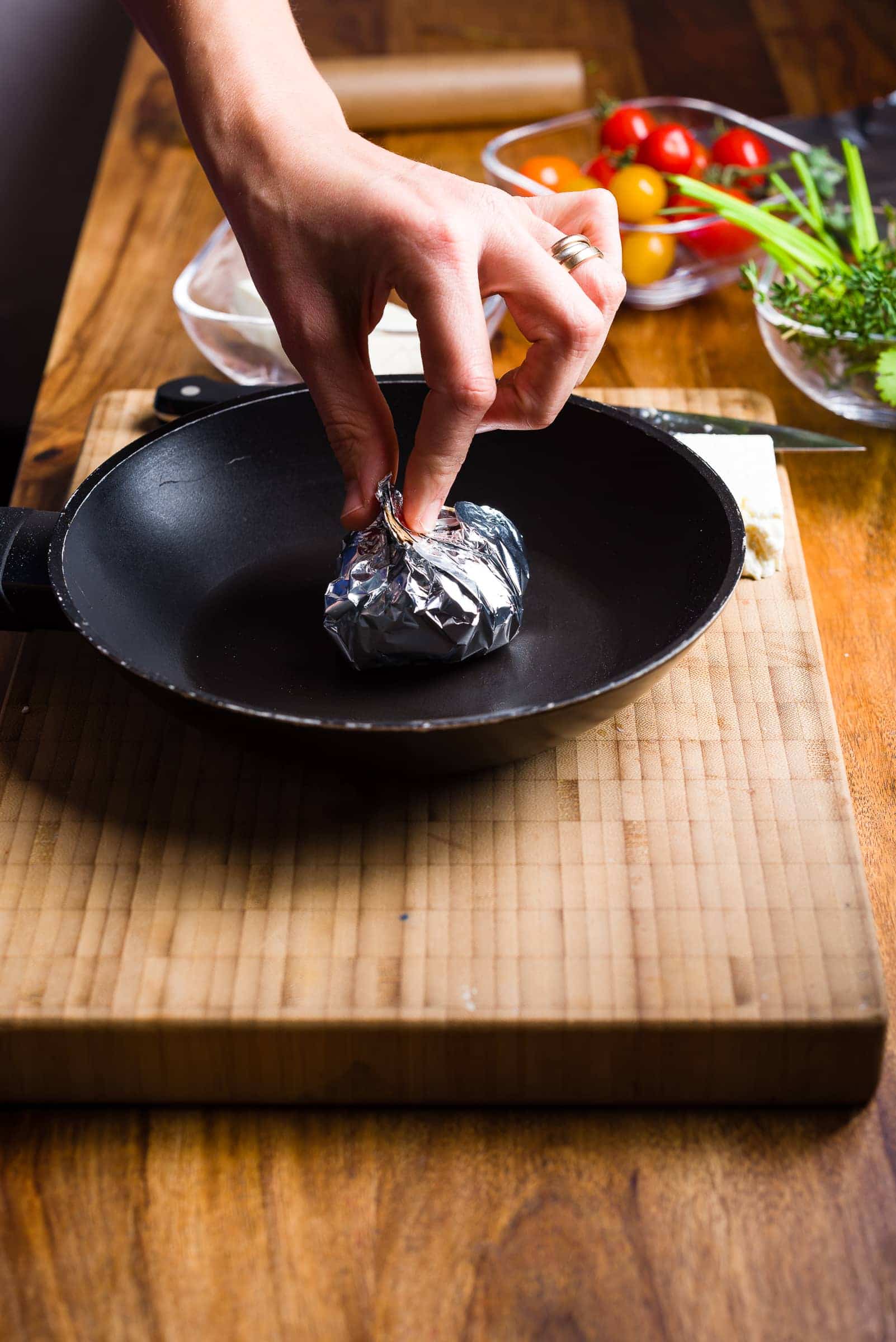 Riscaldate la padella antiaderente fino a quando sentirete un calore deciso avvicinando il palmo della mano. Attenzione a non scottarvi! Posizionate al suo interno i cartocci e lasciate cucinare per circa due o tre minuti ovvero il tempo che il formaggio si rilassi e che le erbe aromatiche rilascino le loro essenze.