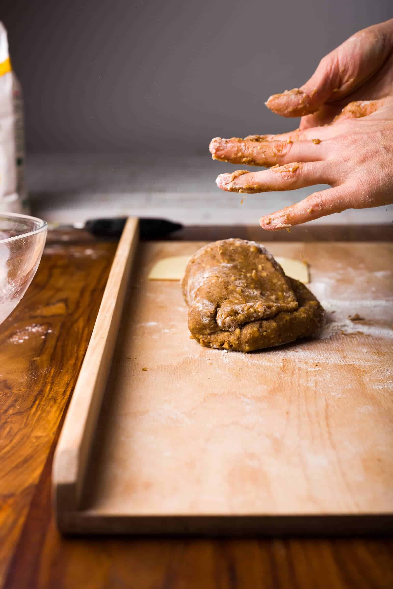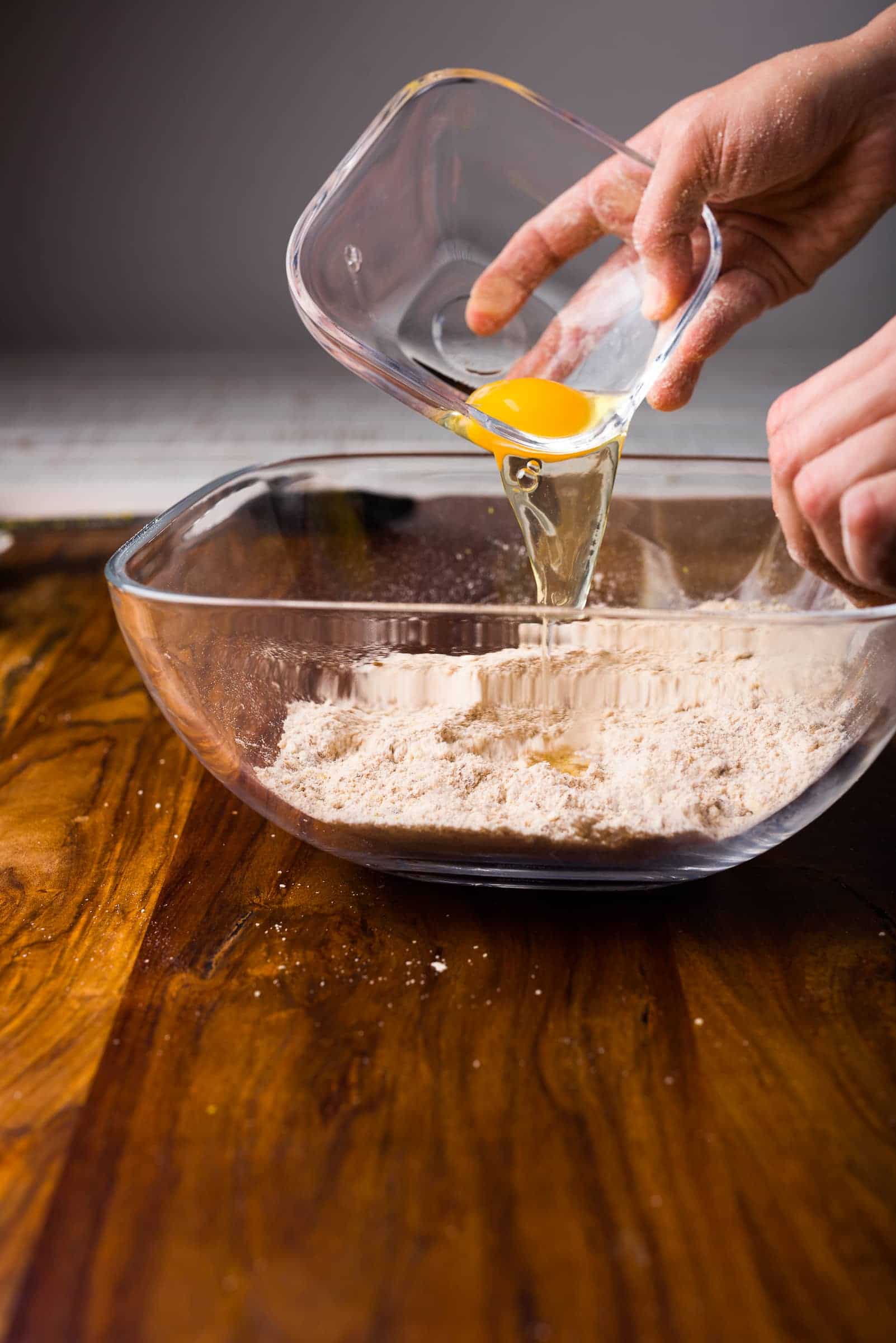 Impastate tutti gli ingredienti procedendo dai solidi ai liquidi. Cominciate con le farine poi burro e uovo fino al raggiungimento di un impasto sodo ed omogeneo. A questo punto trasferte l’impasto su di una spianatoia.