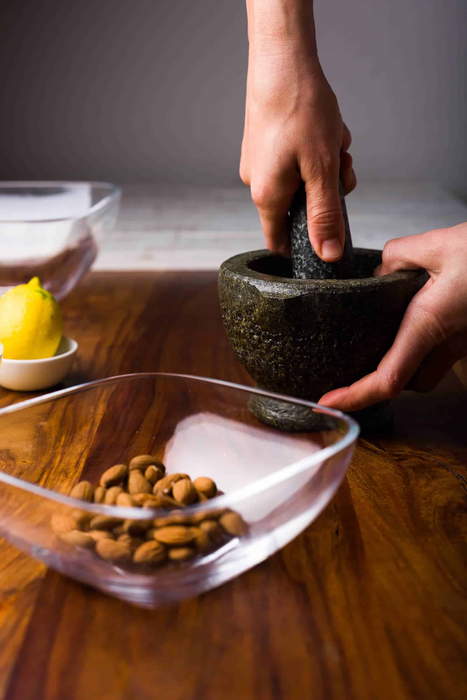 Pestate al mortaio le mandorle senza spellarle fino a ridurle in farina. Trucco GnamAm: se rimangono dei pezzi più grandi otterrete deliziosi tratti dal gusto deciso di mandorla.