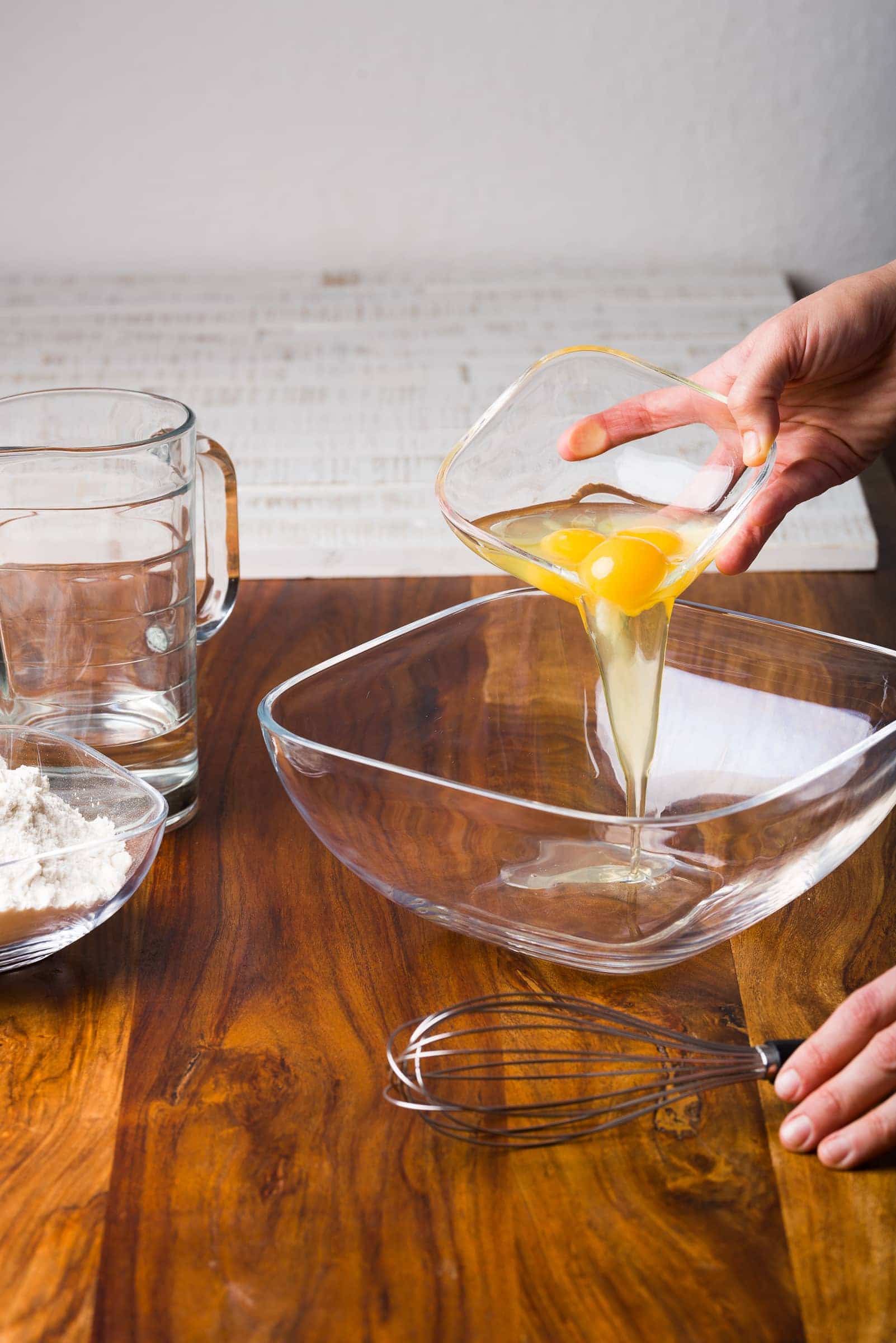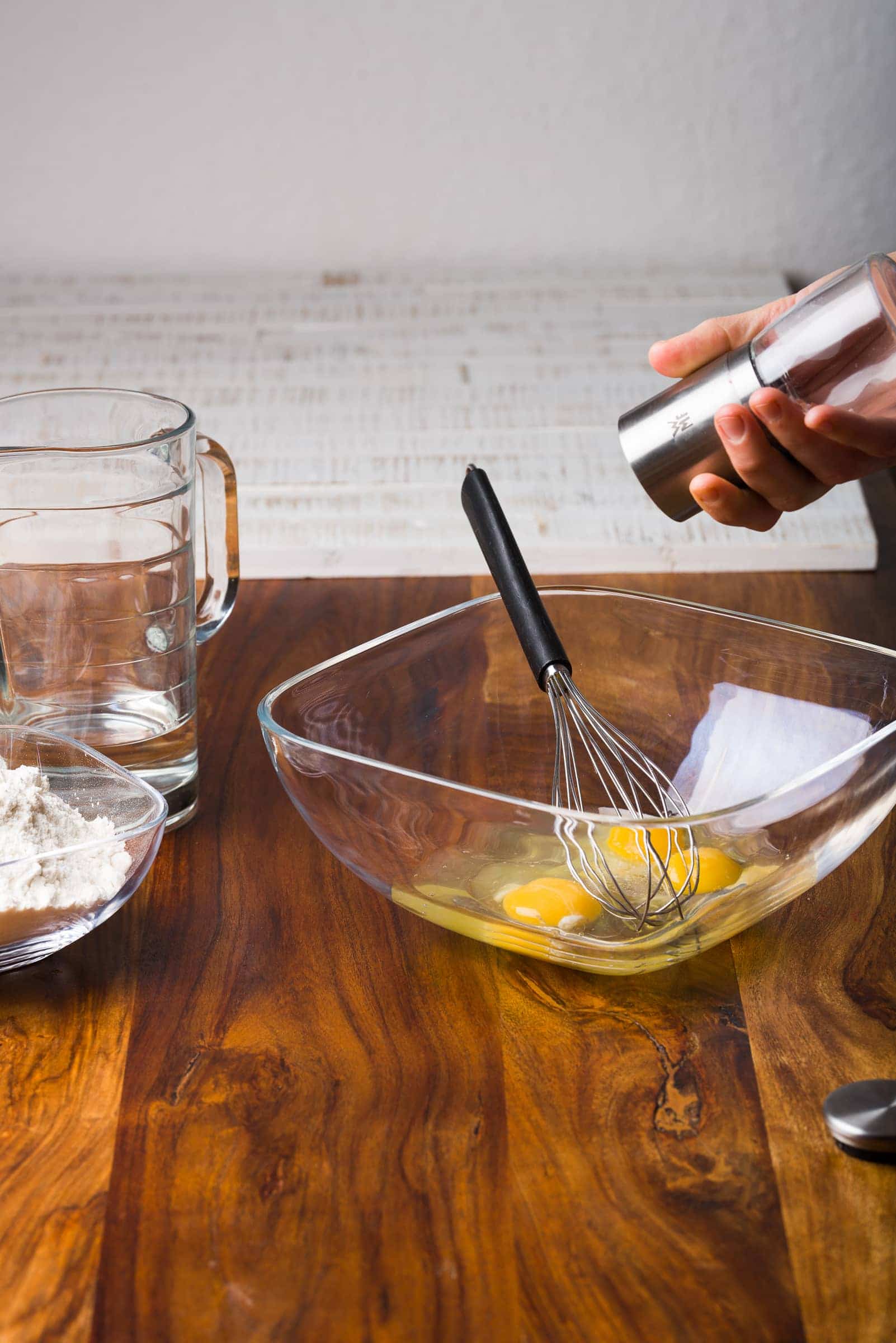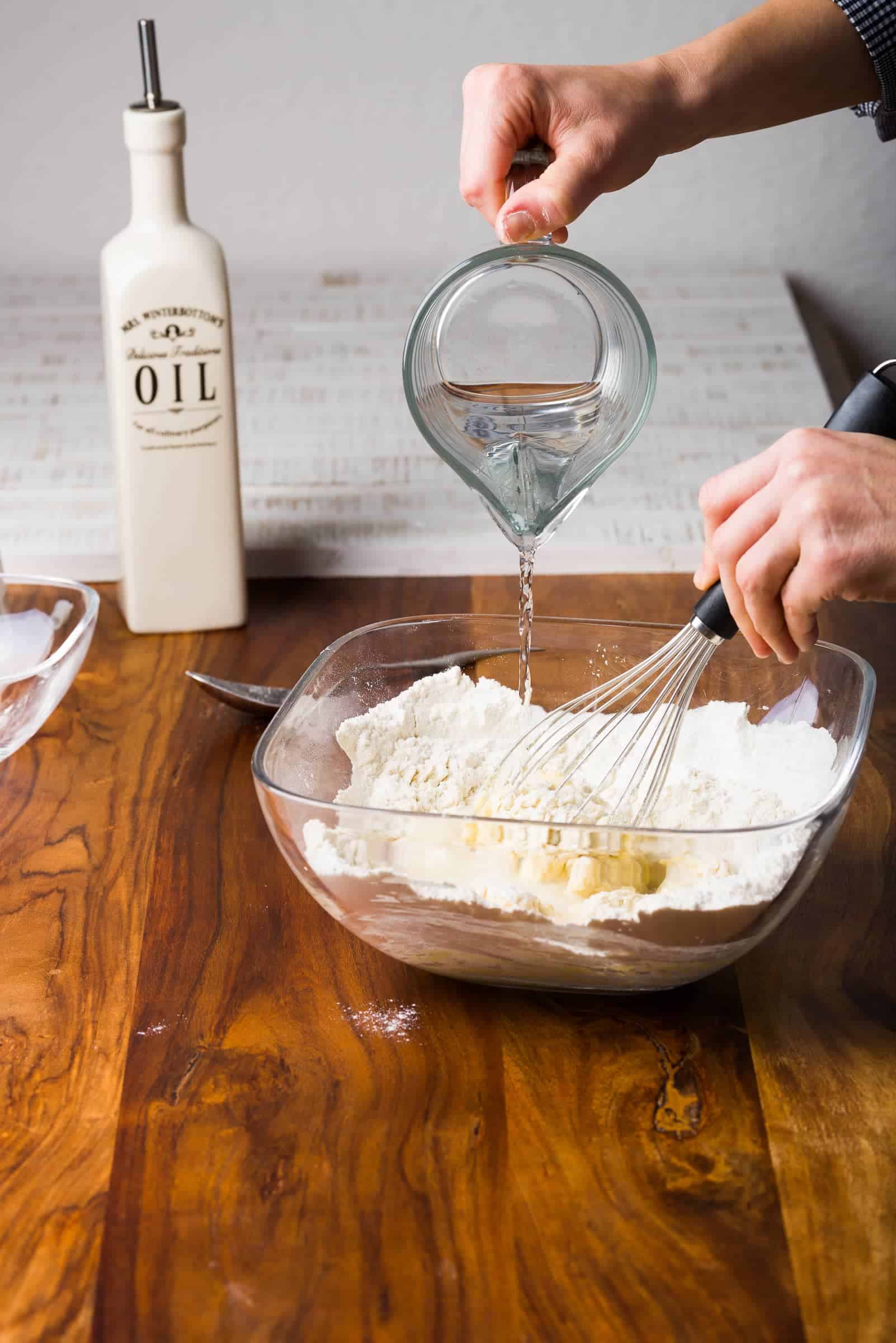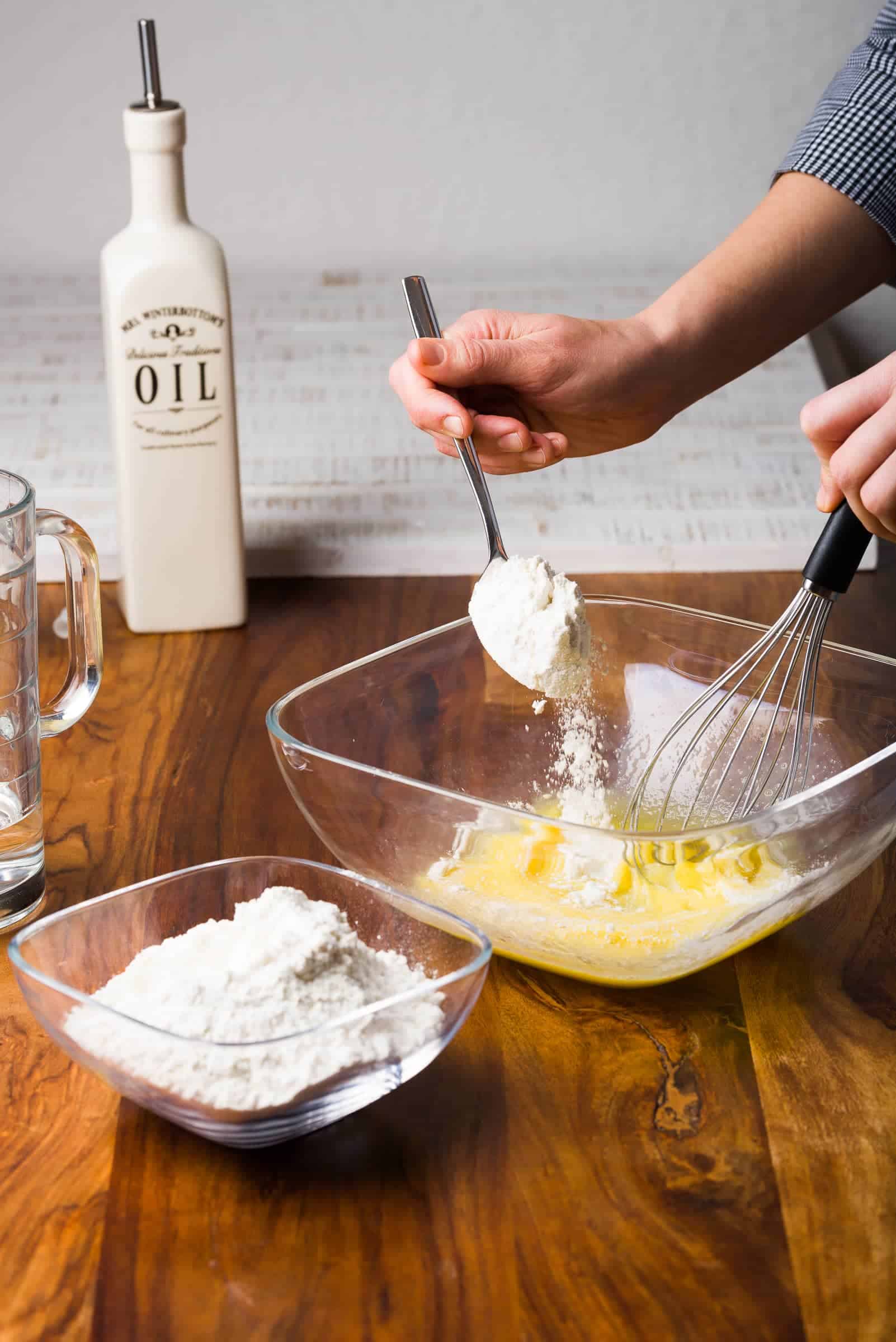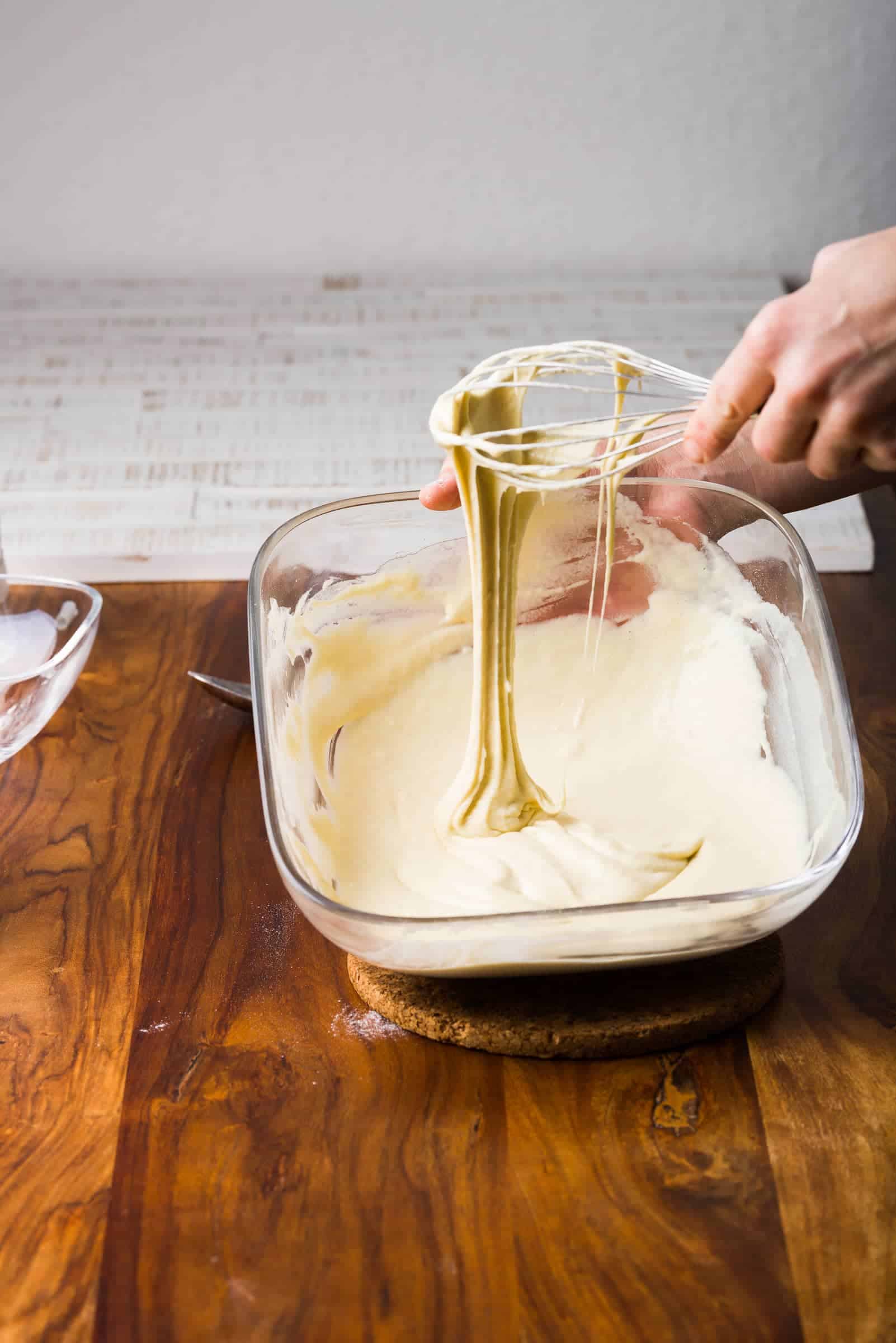 - Aggiungete l’acqua un po’ alla volta e lavorate l’impasto con una frusta energicamente fino all’ottenimento di un composto semi liquido, elastico e che presenti delle bolle dovute all’aria incorporata durante il mescolamento.