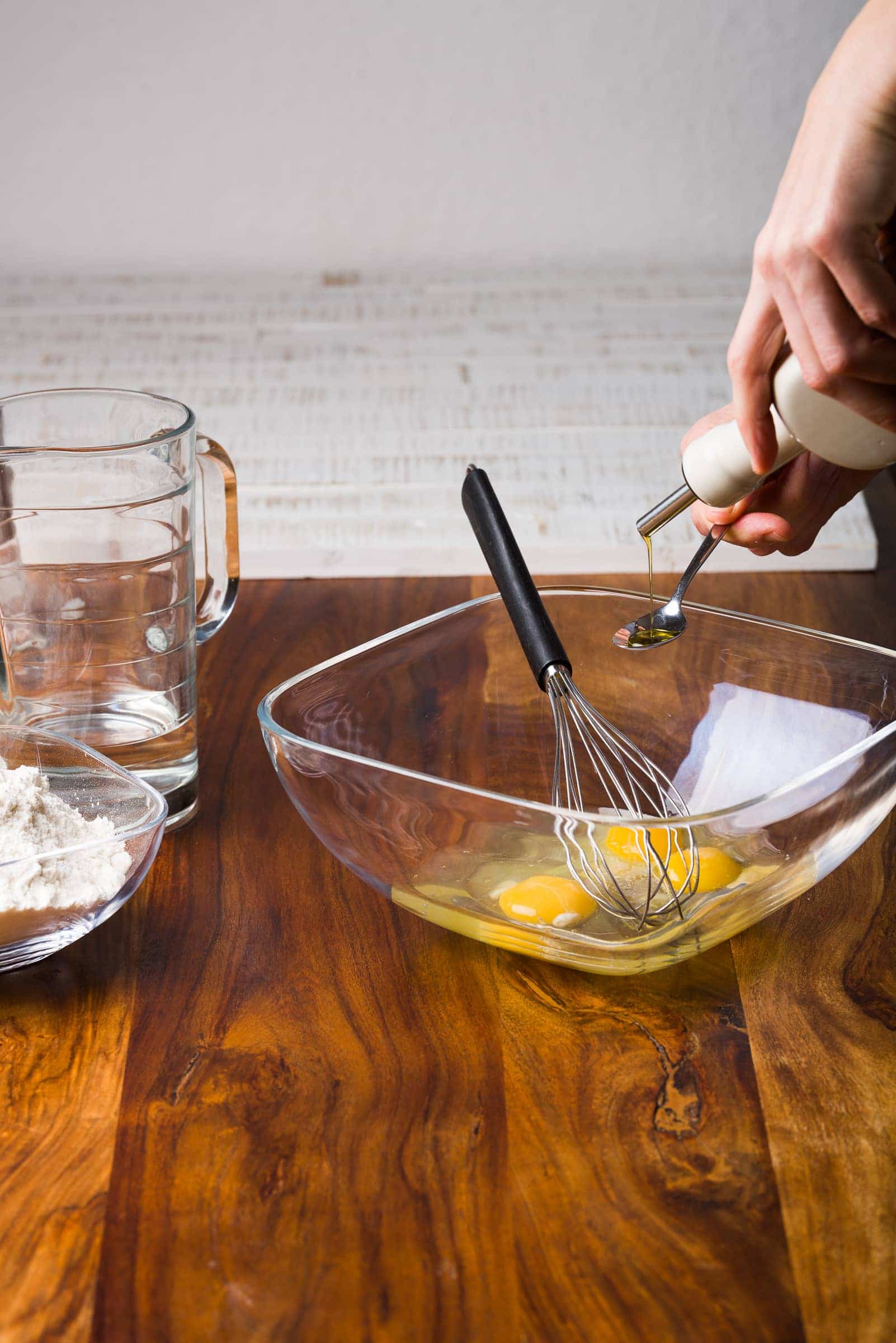 - Mescolate la farina setacciata, le uova, il sale e l’olio.