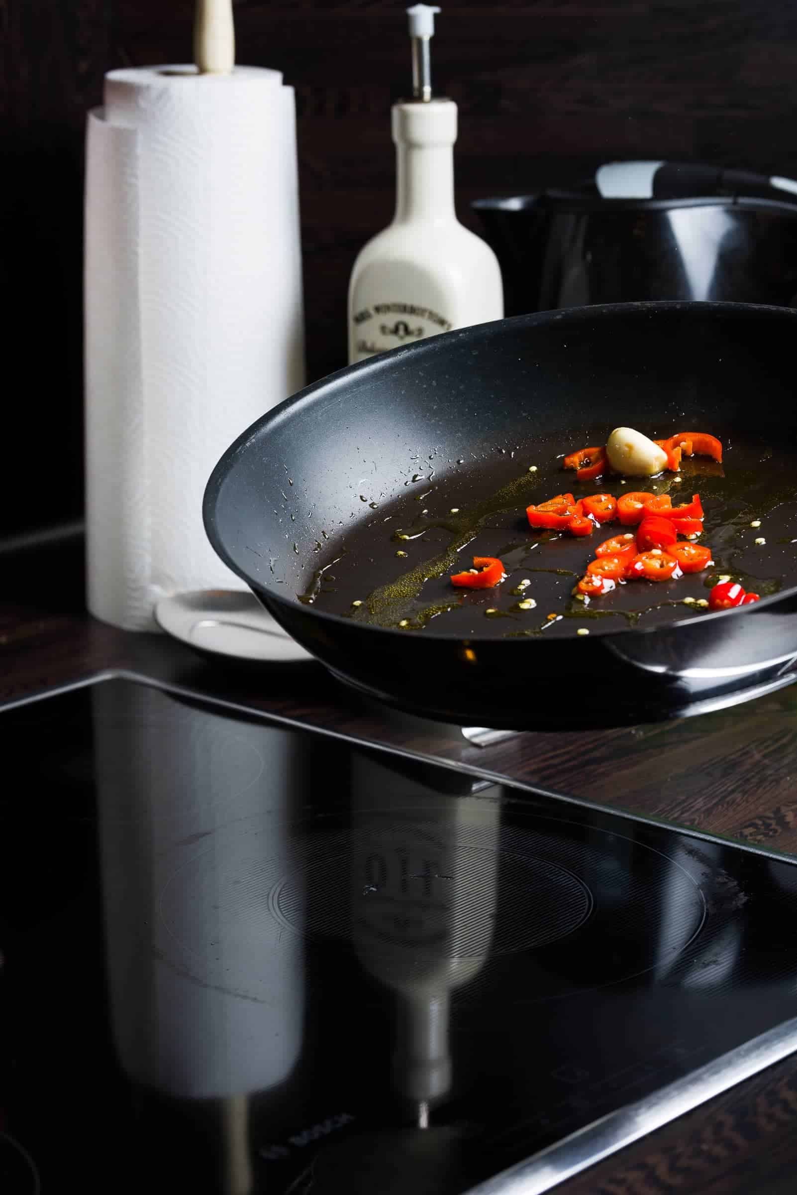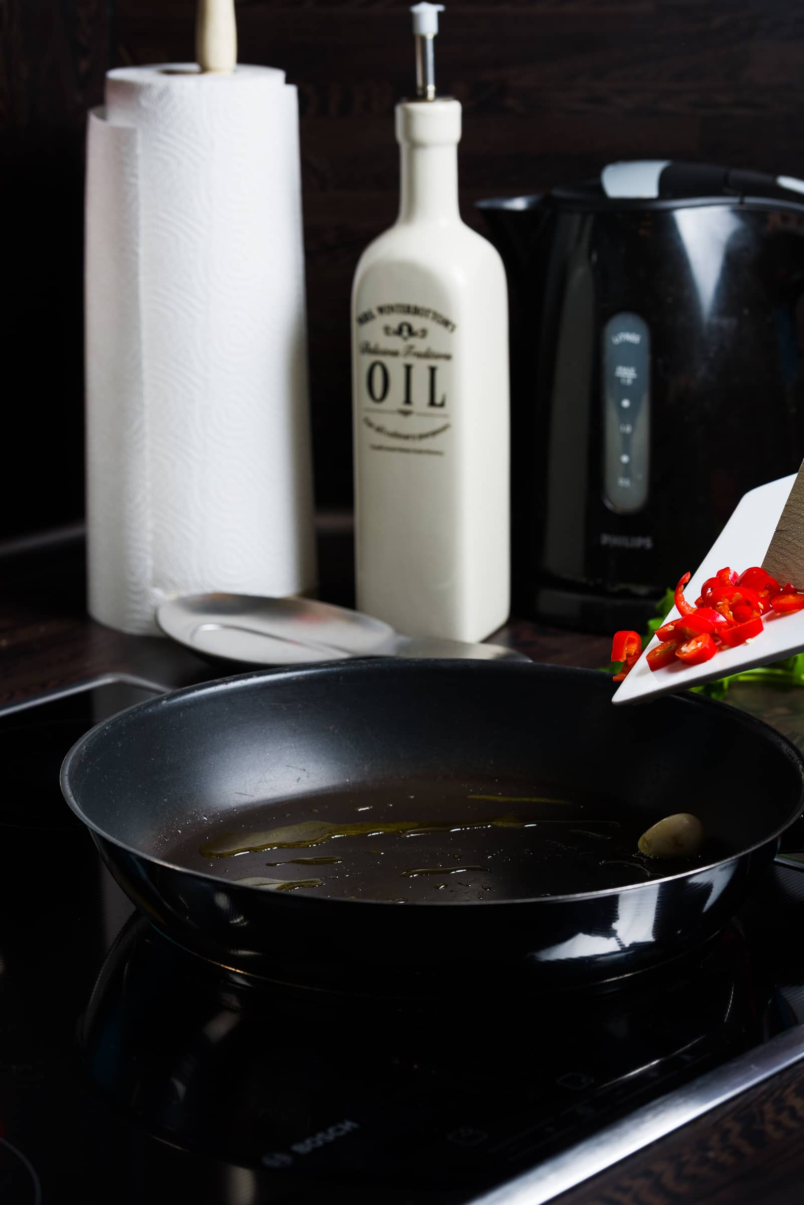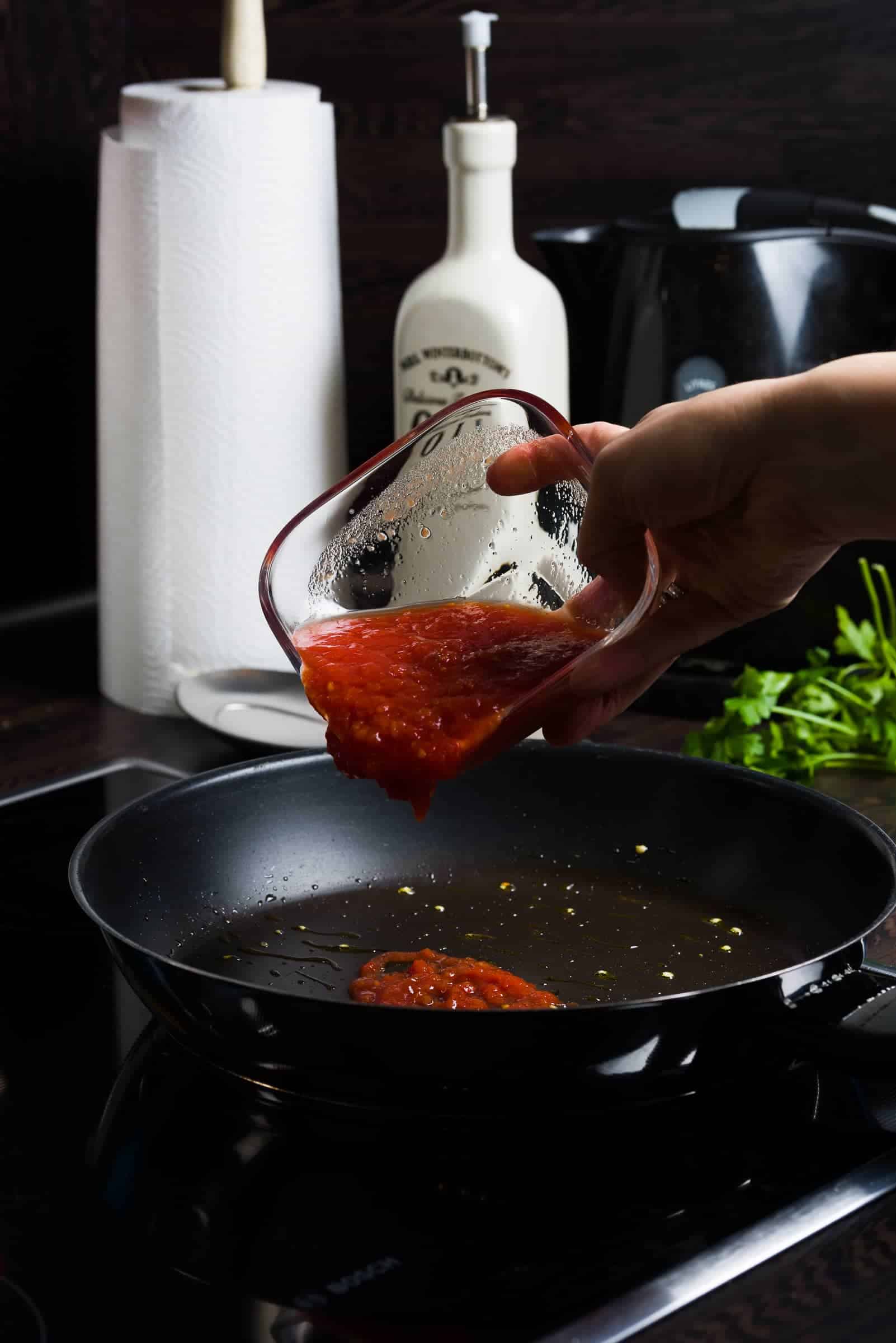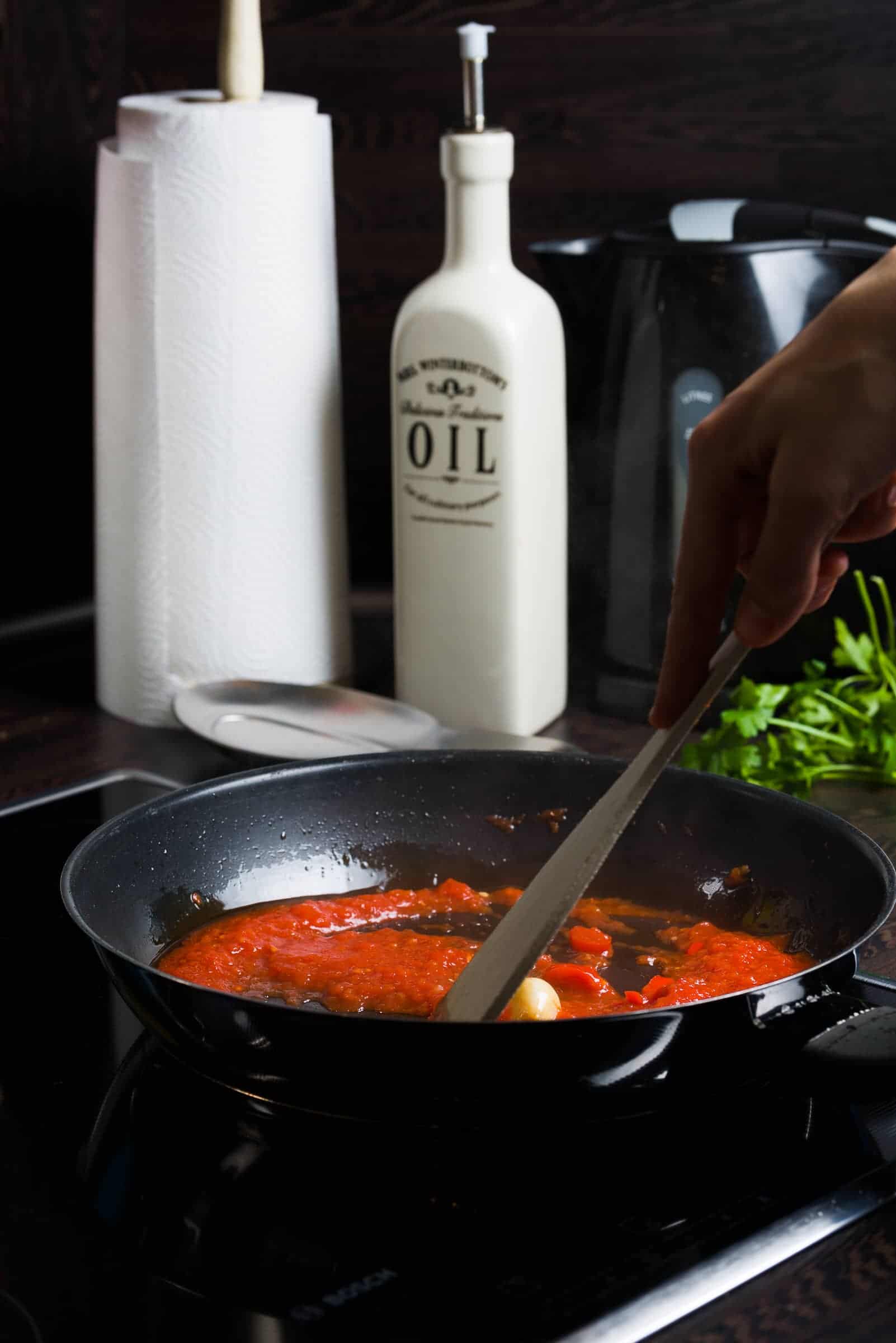 Lasciate insaporire l’olio con l’aglio in una pentola procedendo così: accendete il fornello a fuoco lento e quando l’aglio inizia a sfrigolare abbassate ulteriormente la fiamma e aggiungete il peperoncino, la polpa di pomodoro e un pizzico di sale.