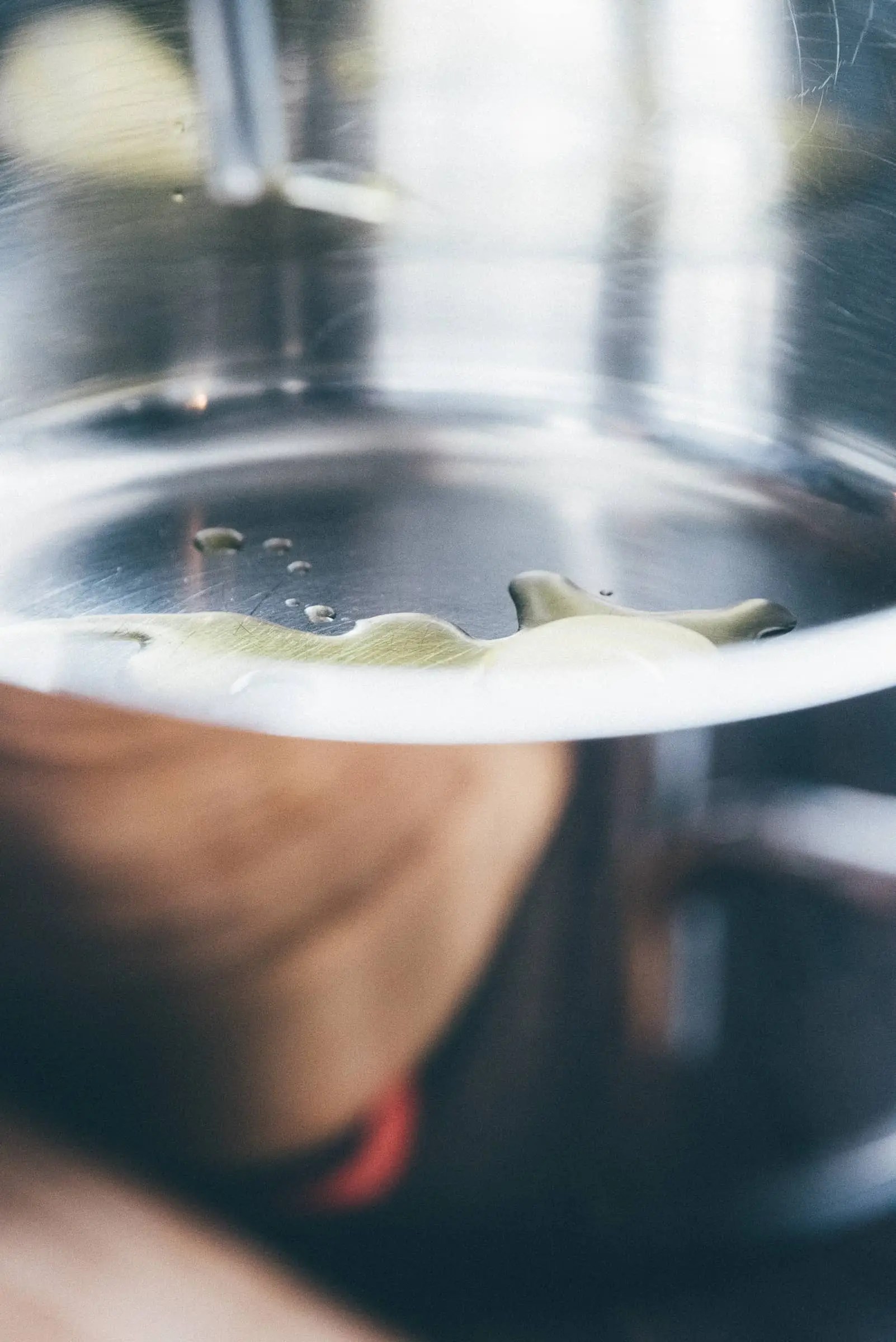 Scaldate in una pentola un cucchiaio di olio extra vergine di oliva con uno spicchio d’aglio.