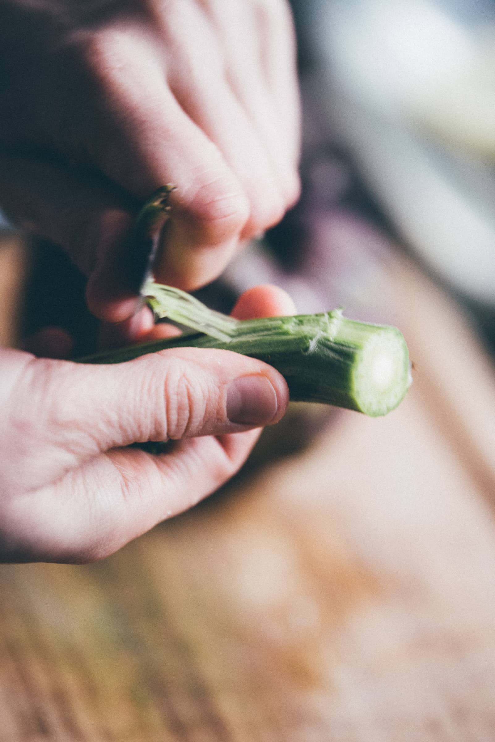 Recidete con il coltello spelucchio il gambo del carciofo. Pelate il gambo ed immergetelo nell’acqua acidulata.