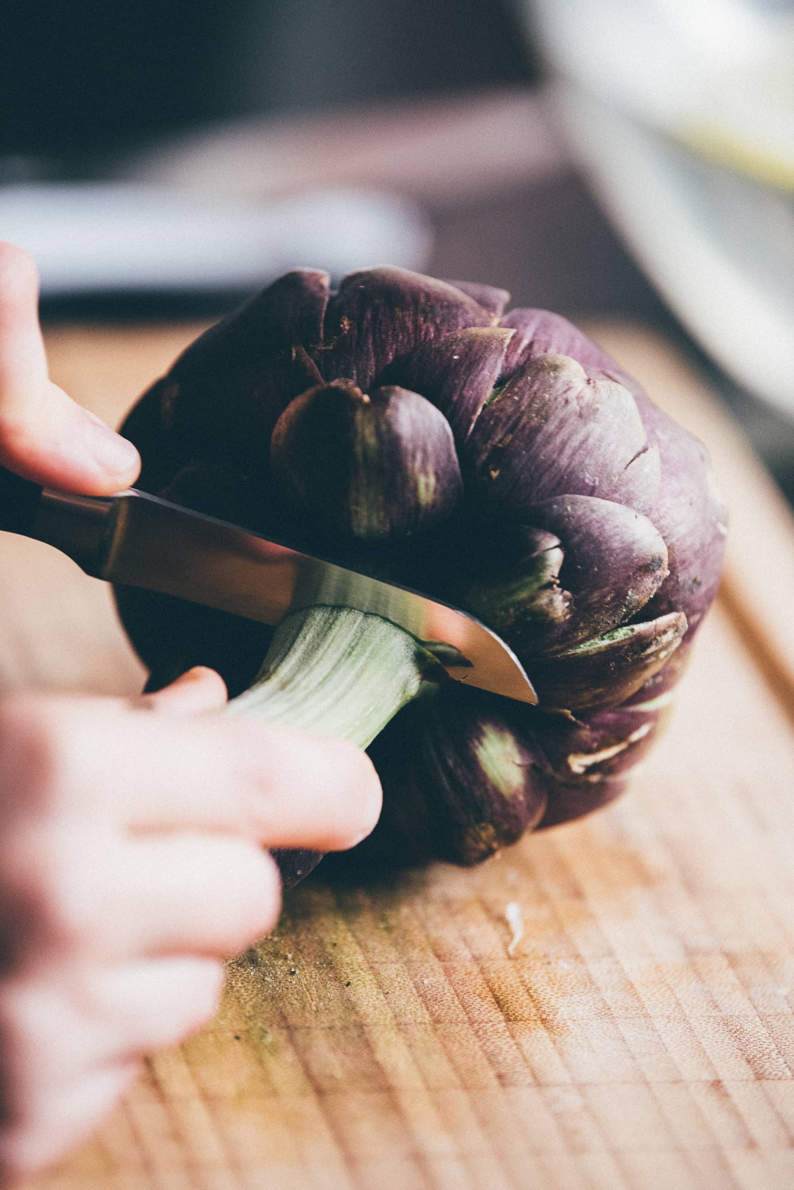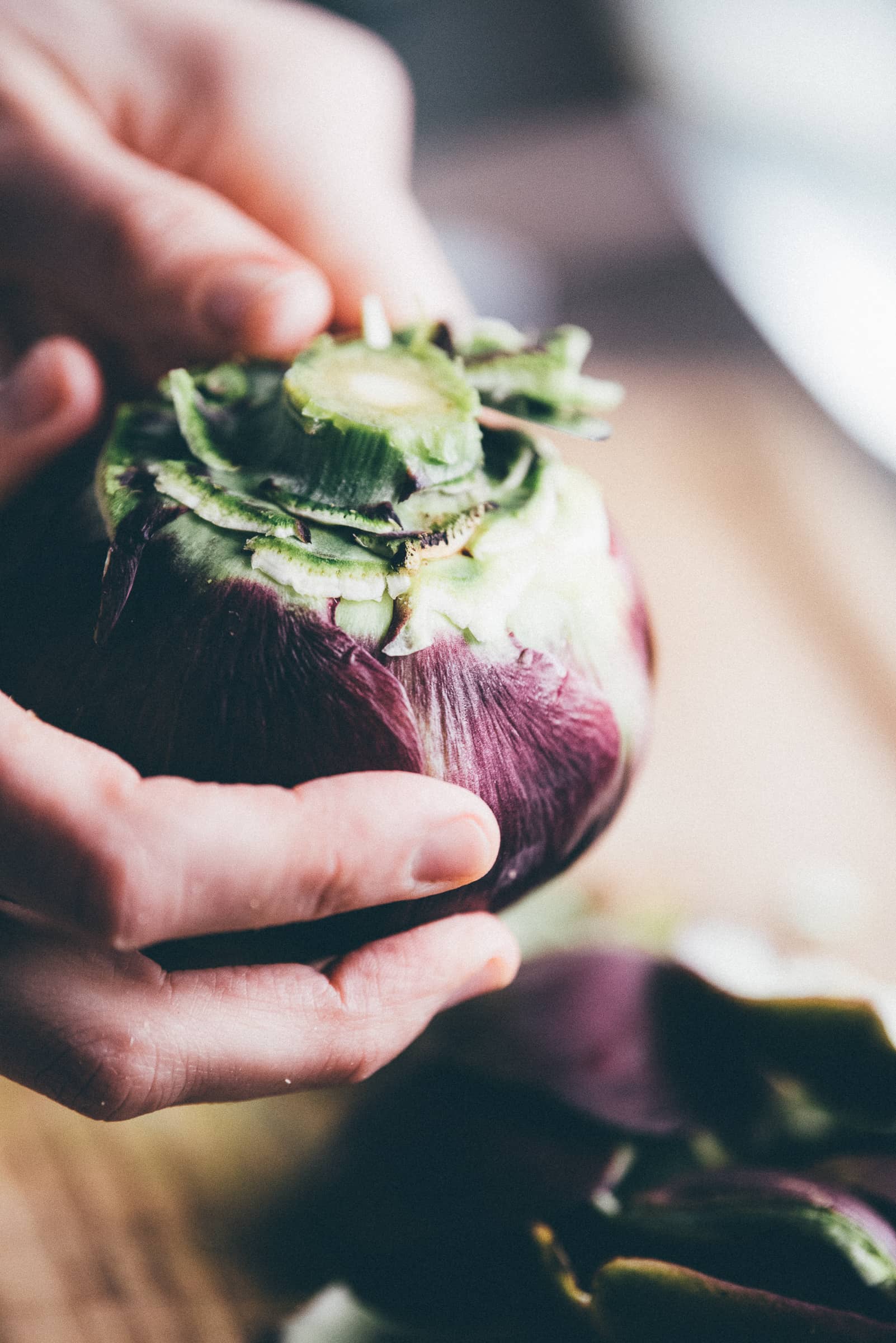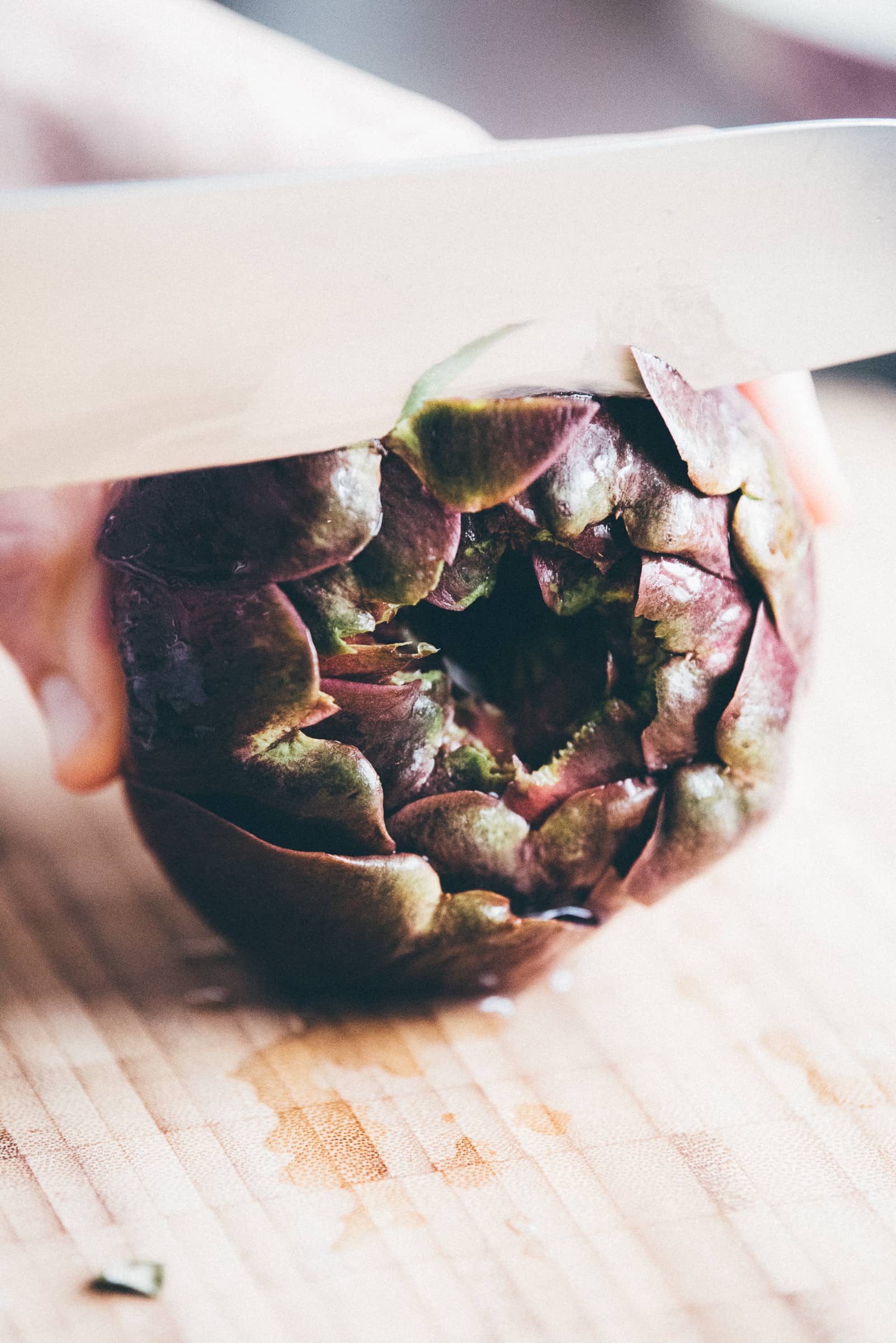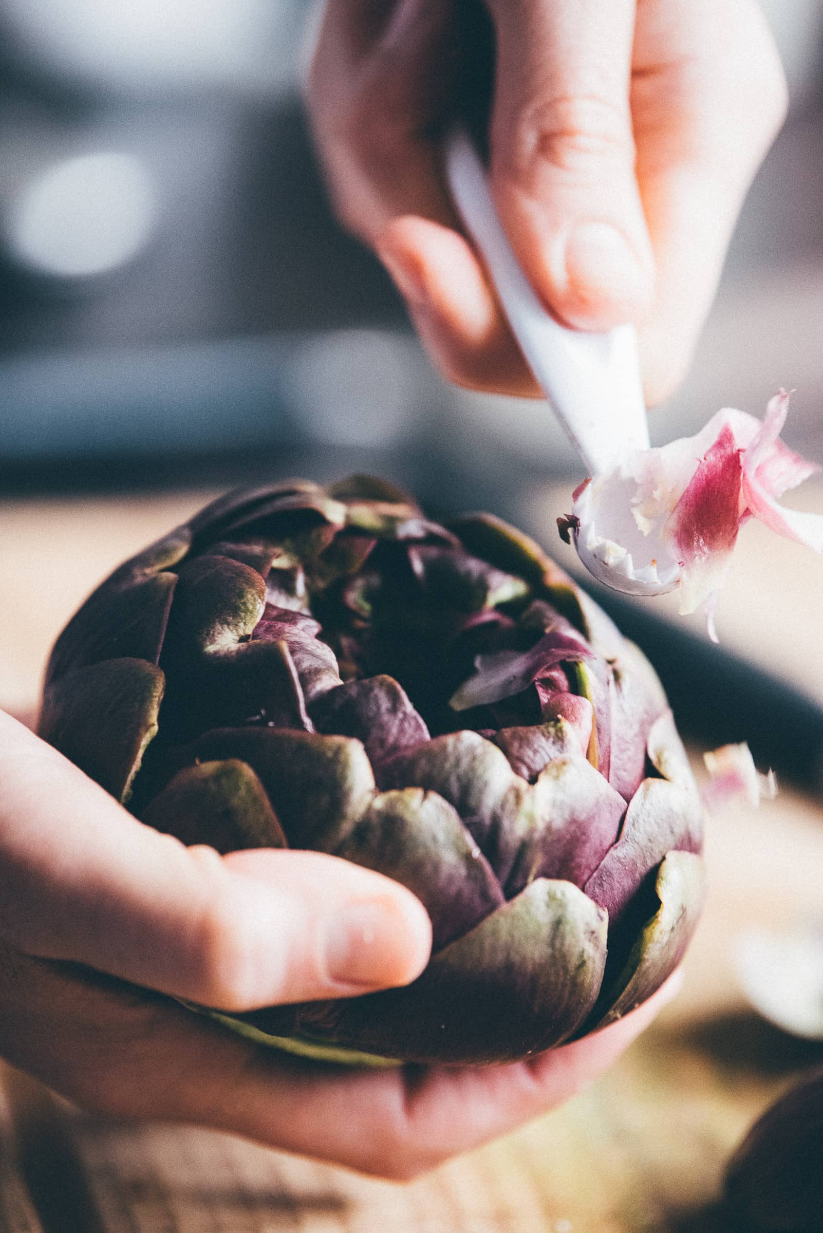 Togliete le foglie più esterne e coriacee, dopodiché tagliate l’estremità superiore del carciofo di circa un centimetro.