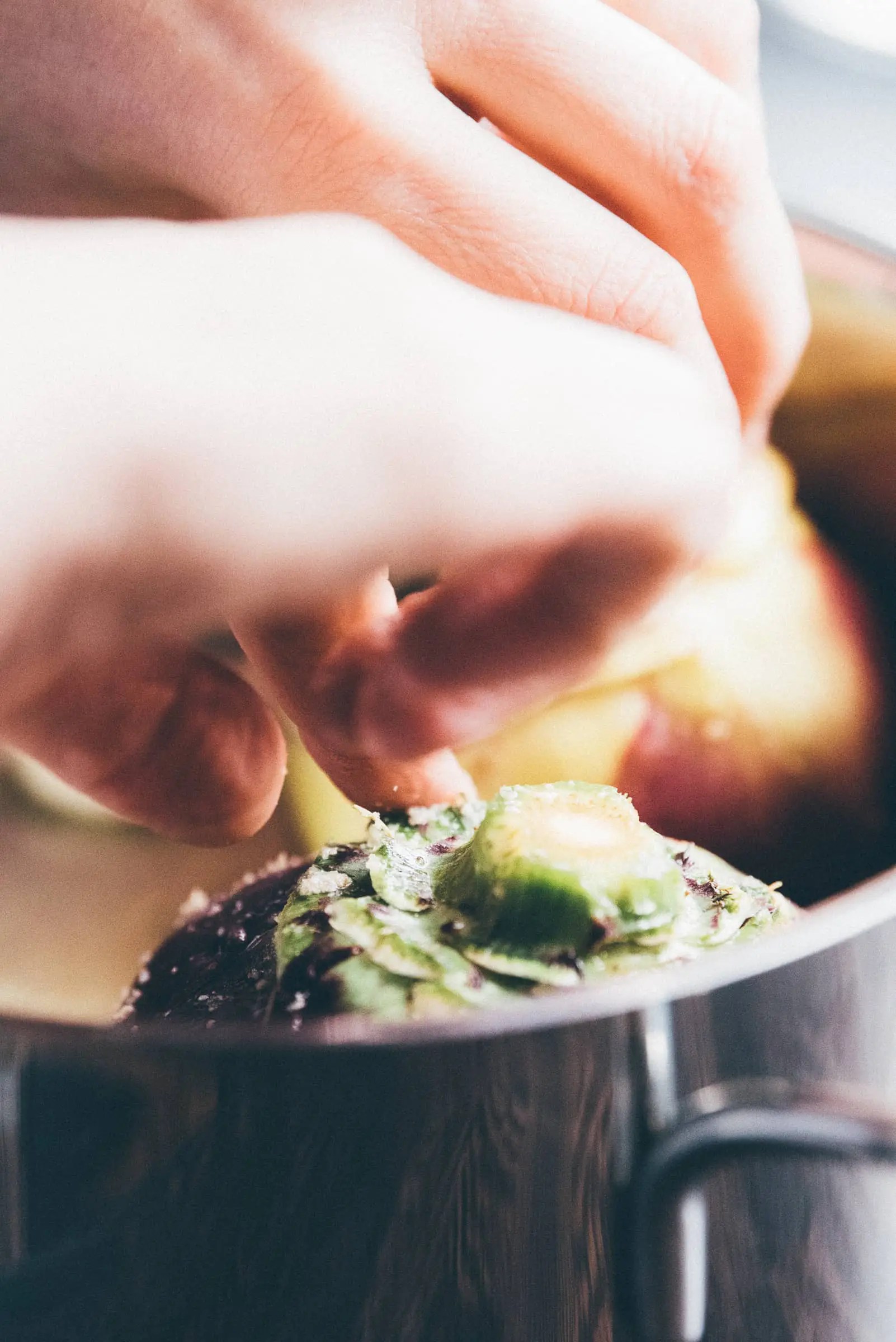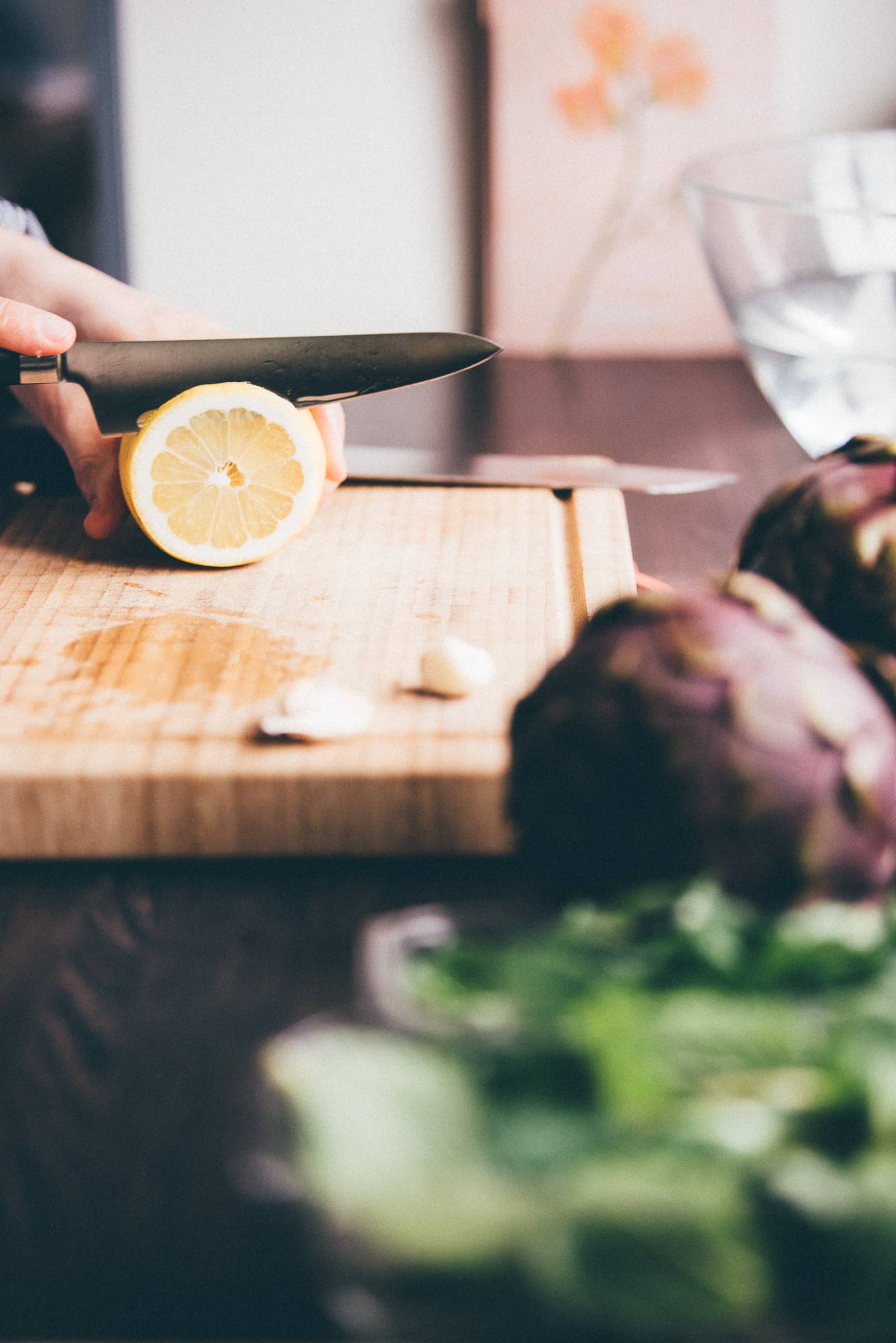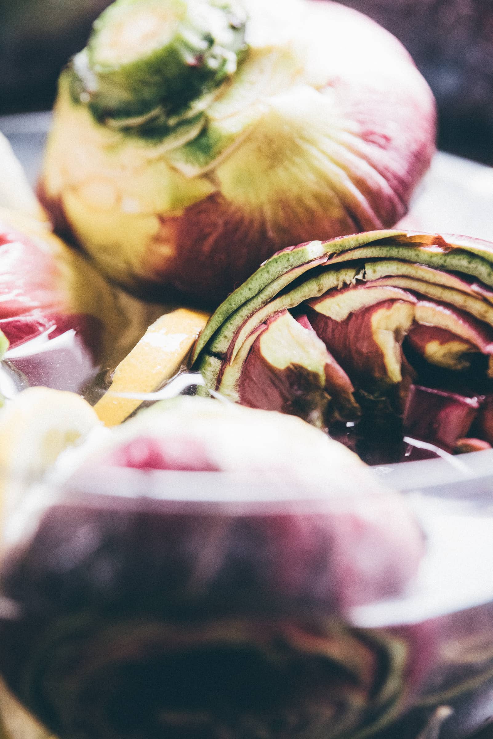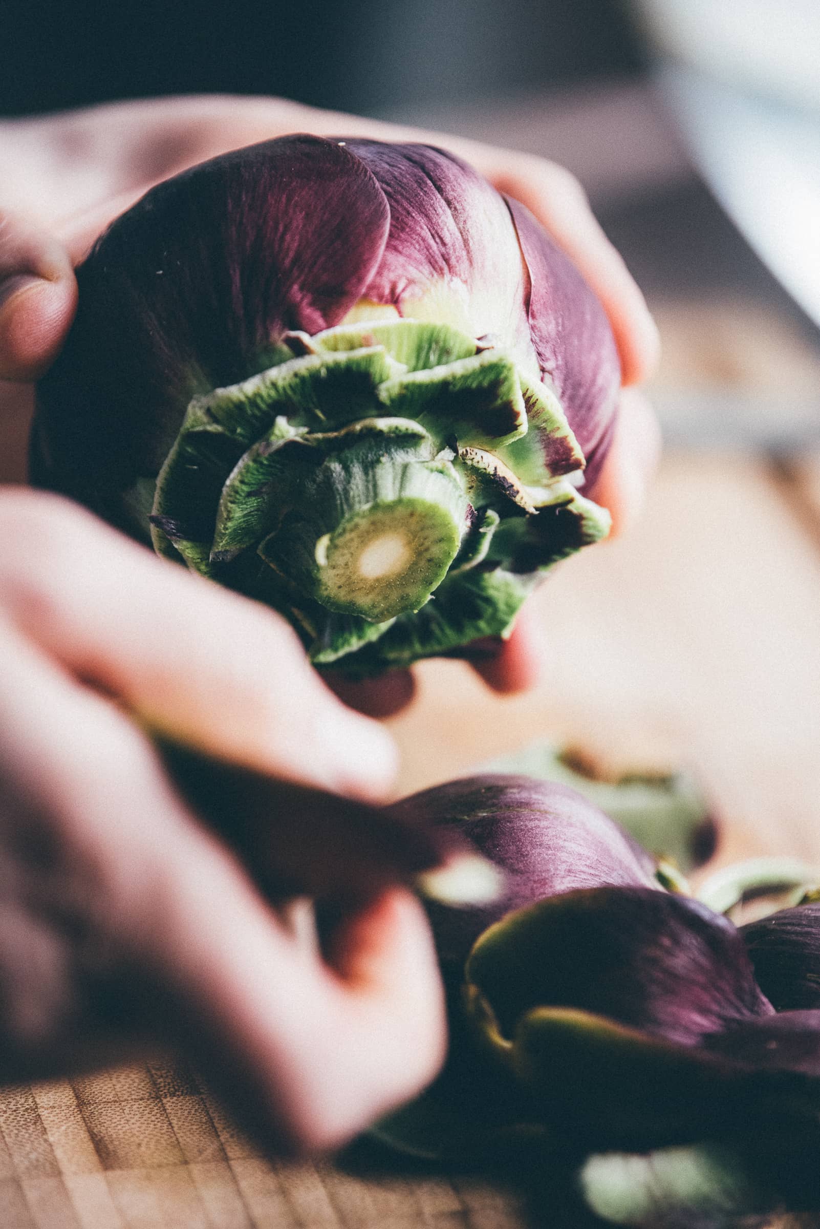 Togliete le foglie più esterne e coriacee, dopodiché tagliate l’estremità superiore del carciofo di circa un centimetro.