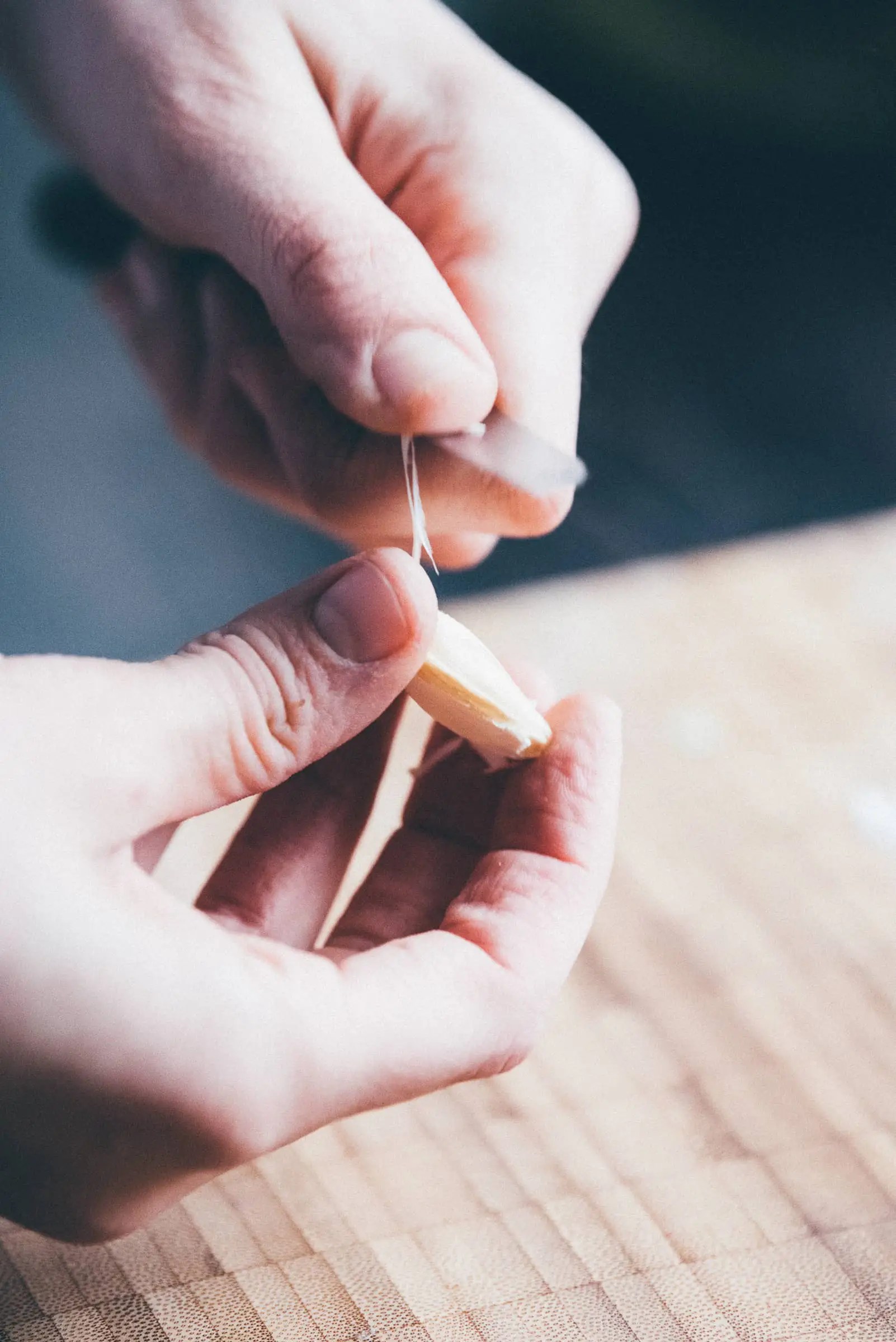 Munitevi di una pentola larga e dai bordi alti, una ciotola capiente, una ciotola piccola, un coltello affilato, uno scavino, uno spelacchio (coltellino a lama dritta per sbucciare, incidere e pelare).