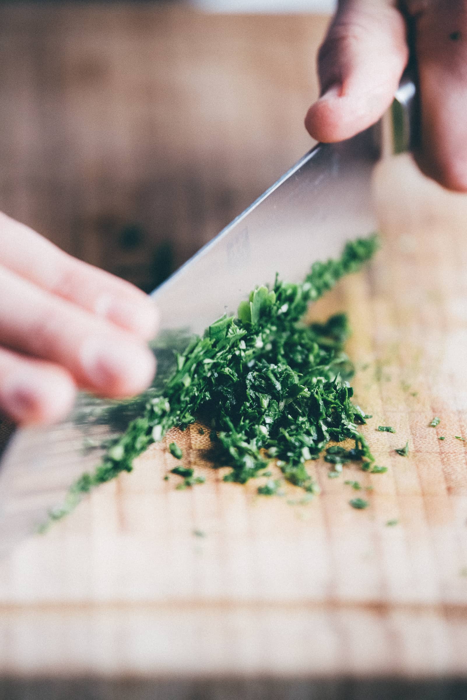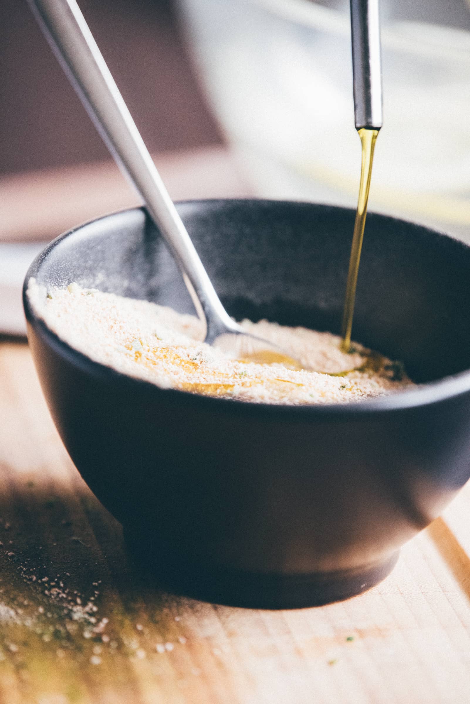 Mescolate all’interno della ciotola il trito di prezzemolo, menta, molliche di pane integrale, un cucchiaio di olio extra vergine di oliva e un pizzico di sale.