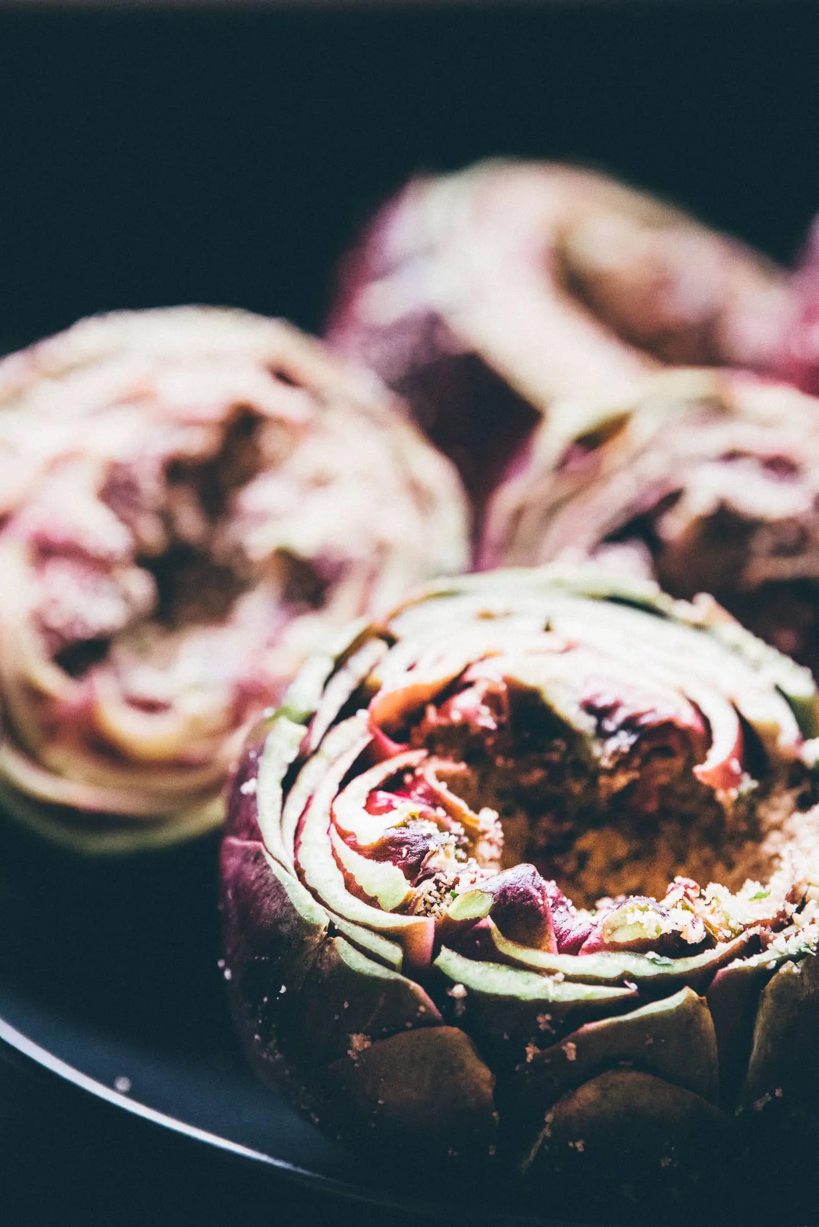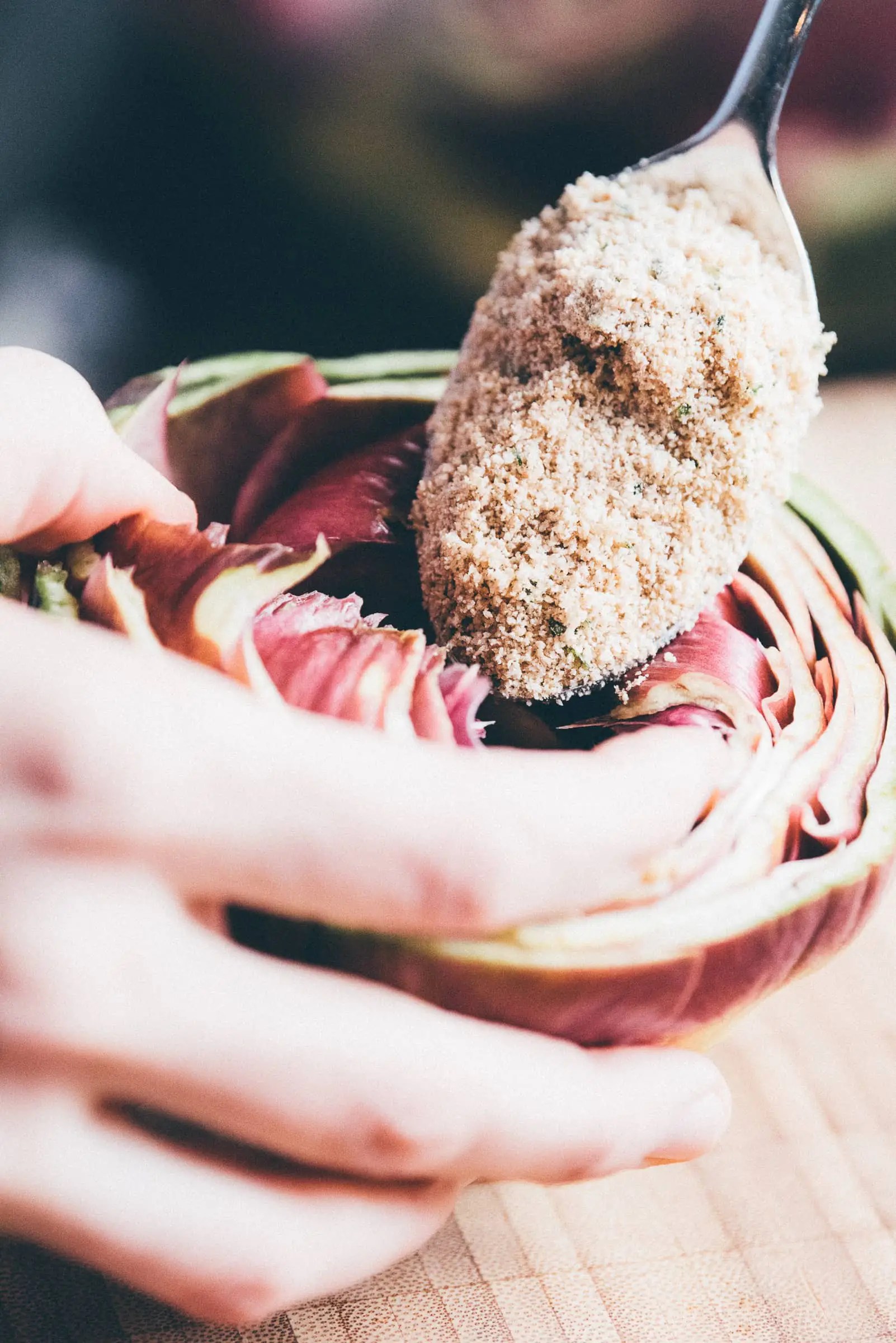 Un segreto: io li farcisco con le molliche di pane integrale e prezzemolo, aggiungendo infine un paio di foglie di menta. Trovo che la menta conceda un sapore fresco e si sposi bene con il dolce del carciofo.
