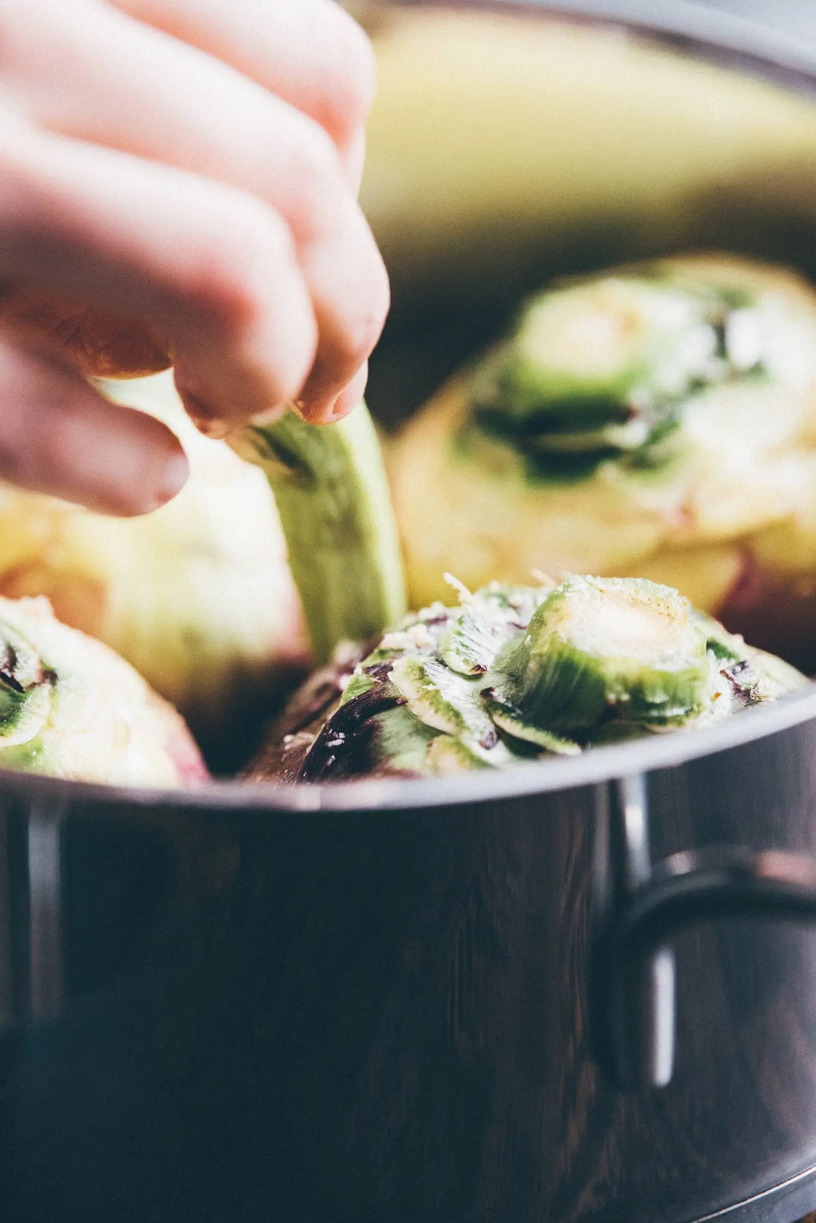 Nota: Il liquido deve restringersi, il carciofo deve risultare morbido se infilzato con una forchetta. I tempi di cottura variano a seconda del carciofo.