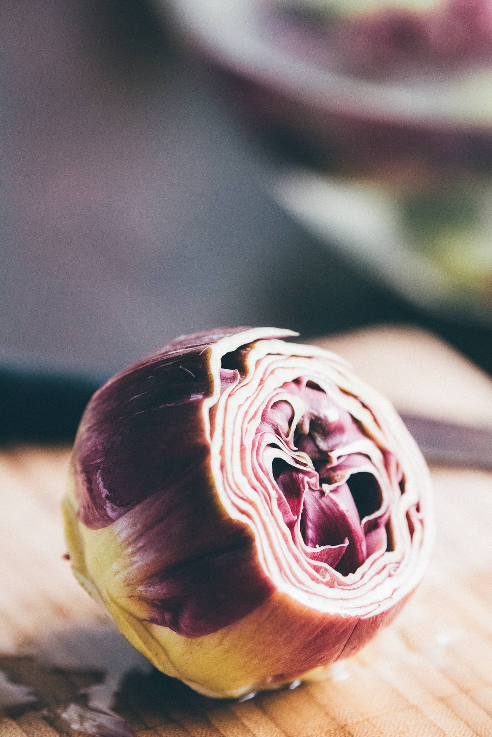 Scavate l’interno del carciofo con l’aiuto di uno scavino o un coltellino per eliminare la peluria interna ed eventualmente le spine presenti.