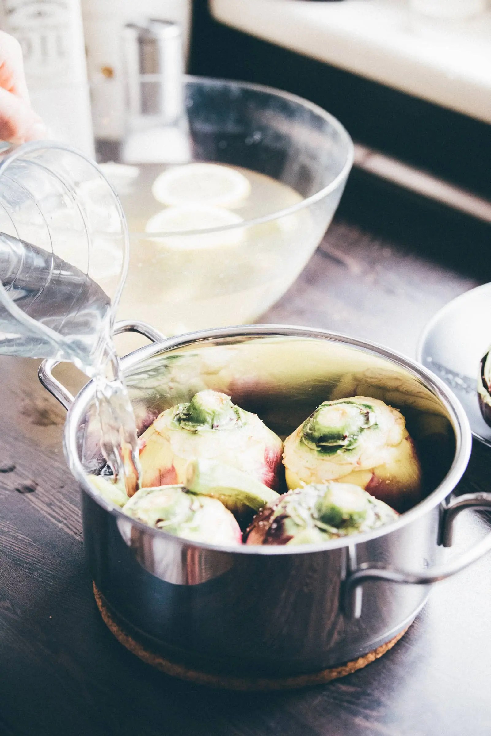 Adagiate i carciofi all’interno della pentola a testa in giù, aggiungete dell’acqua fino a coprire 3/4 del carciofo. Lasciate fuori massimo un paio di centimetri.
