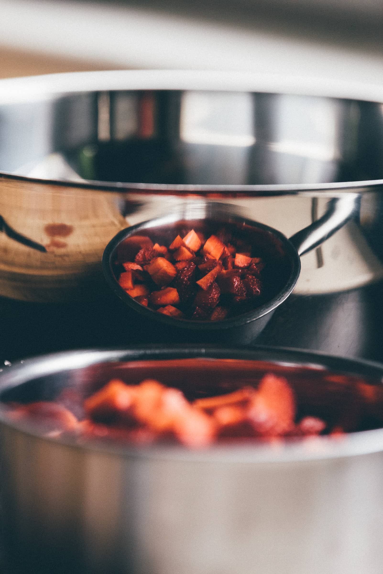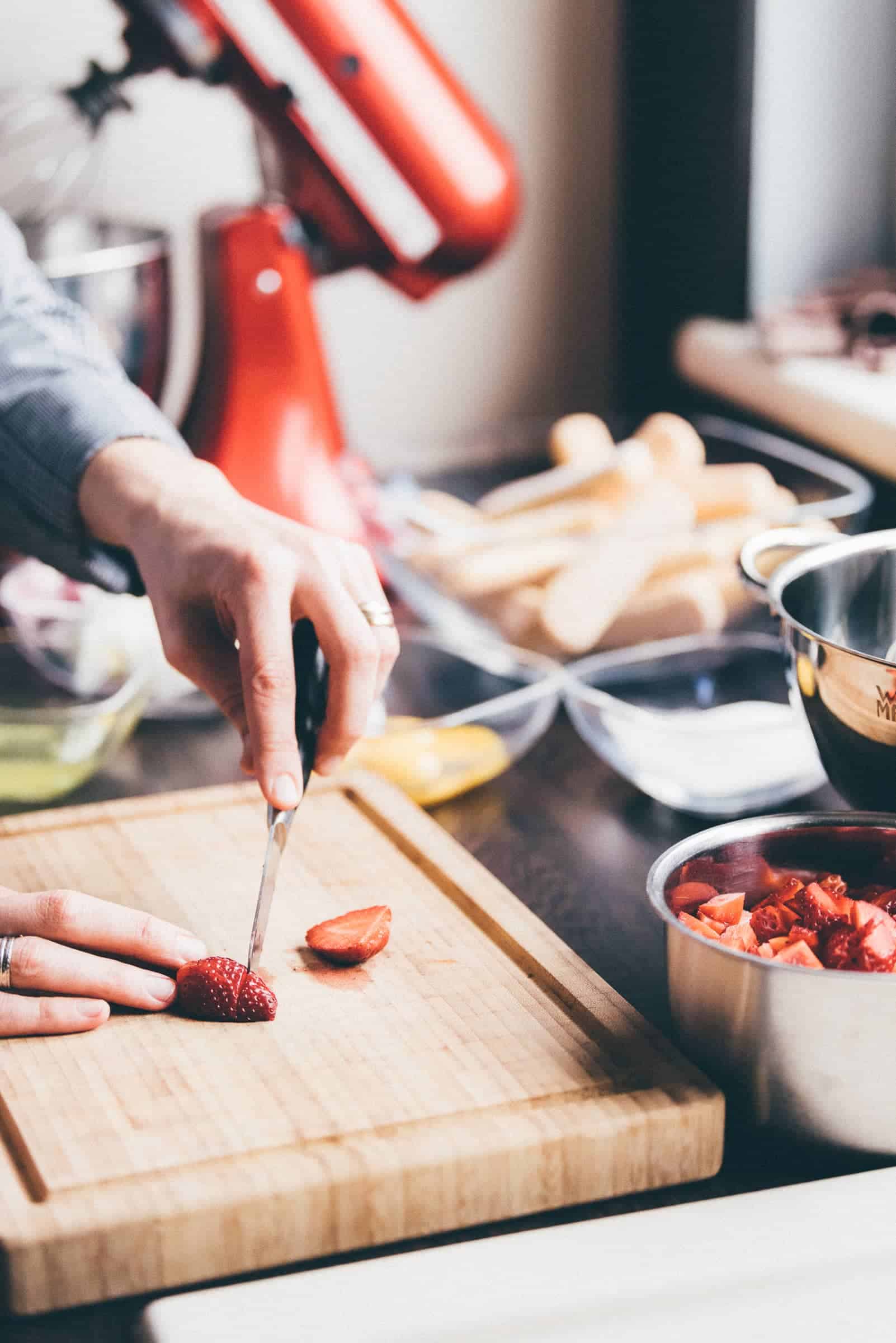 Munitevi di due pentolini: uno per lo sciroppo di fragole un’altro per lo sciroppo di zucchero, due ciotole capienti, un frullatore elettrico, una frusta a mano, un termometro da cucina ed infine una pirofila.