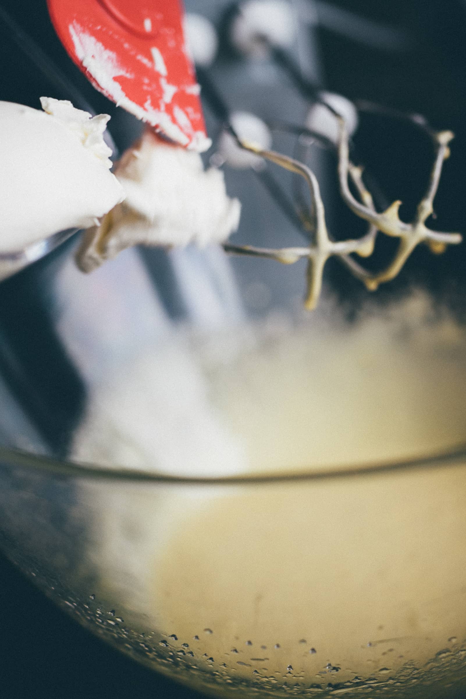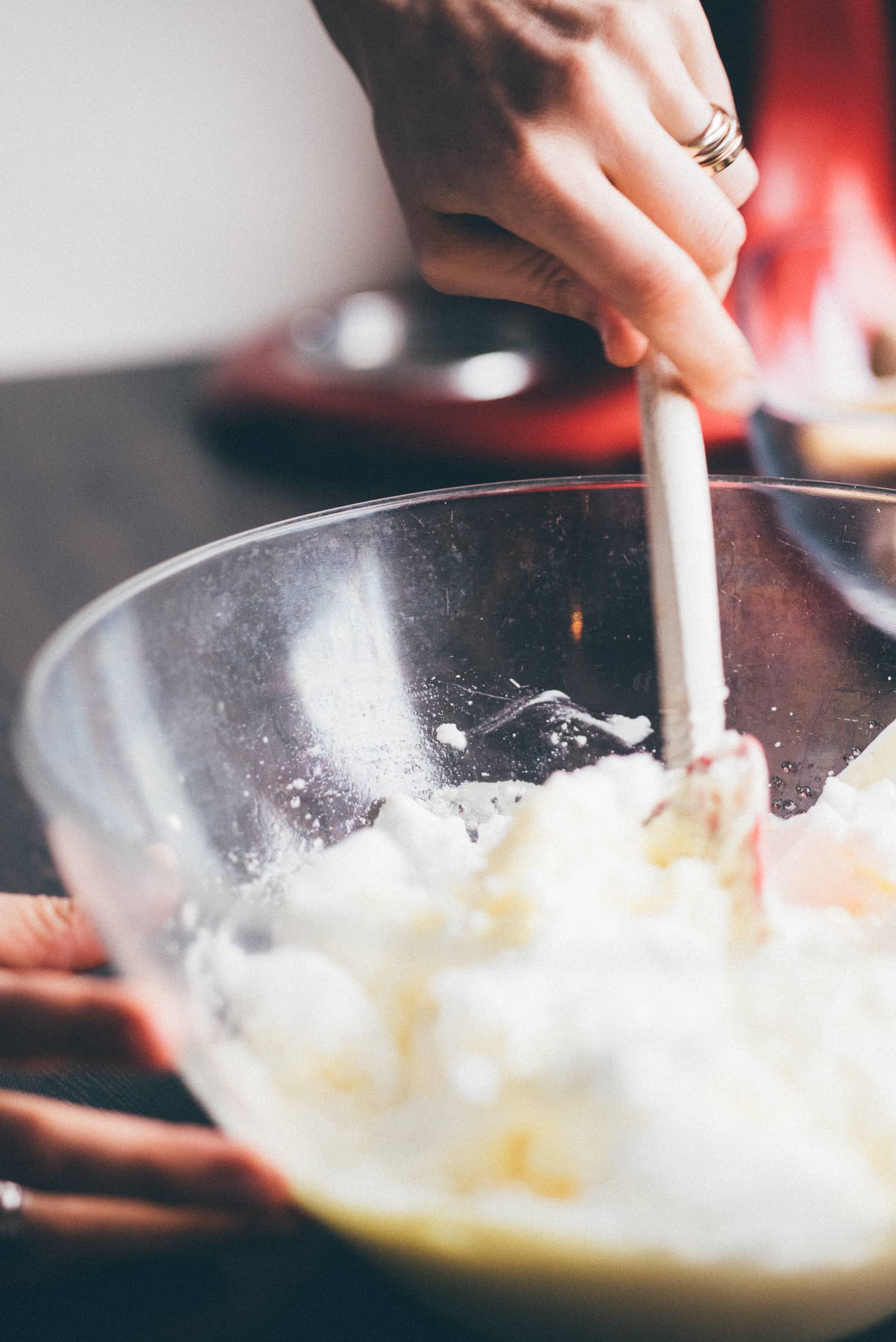 Aggiungete gli albumi alla crema al mascarpone, girando dall’altro verso il basso, in modo che il composto rimanga bello gonfio e spumoso.