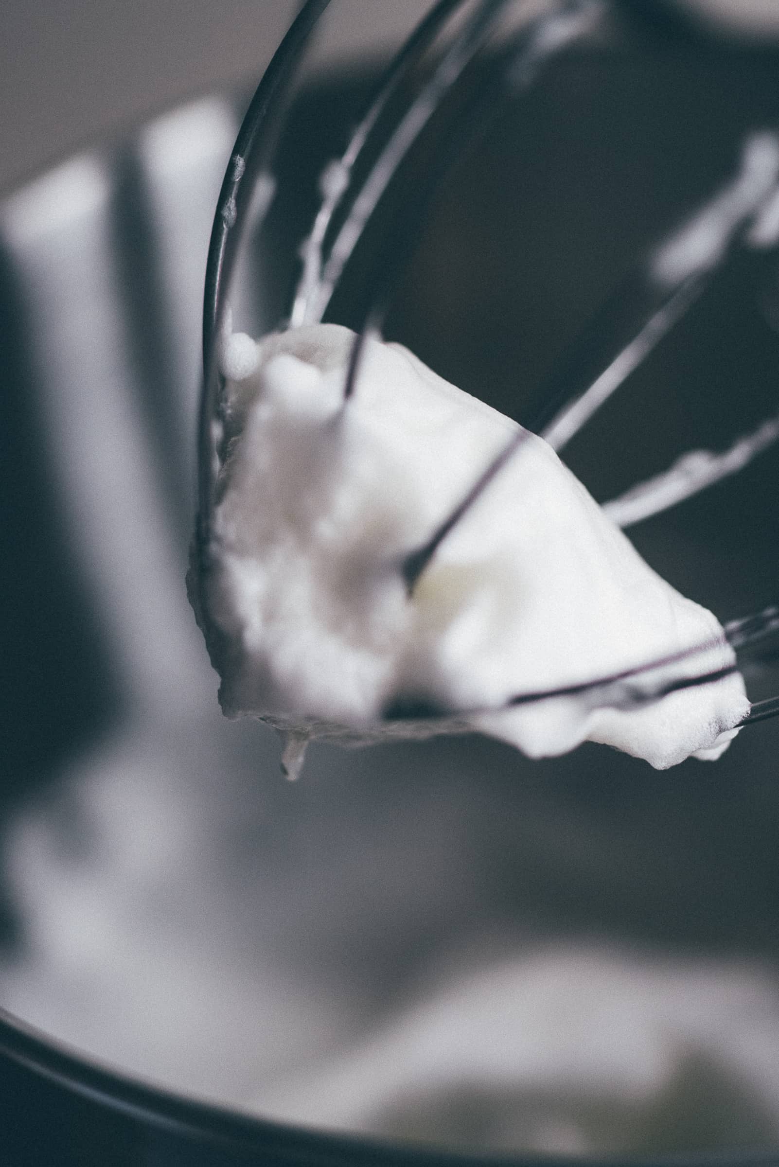Montate a neve gli albumi facendo molta attenzione ad utilizzare una ciotola e una frusta ben pulite, a metà della montatura aggiungete a filo lo sciroppo di zucchero. Continuate a montare gli albumi lasciandoli un pò morbidi. Non devono essere montati a neve ferma.