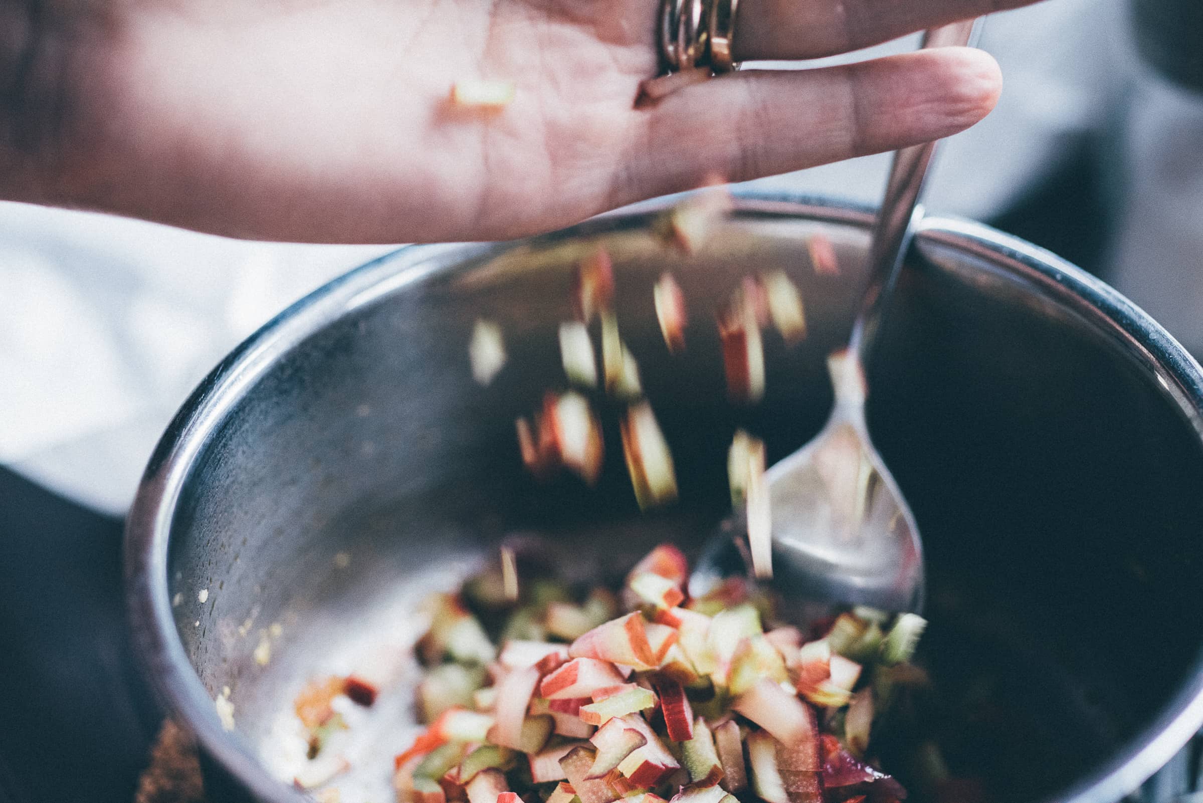 Lavate ed asciugate il rabarbaro, privatelo della parte terminale e delle foglie. Affettatelo in dadini molto piccoli aggiungendolo al pentolino con la cipolla ormai ridotta in poltiglia.