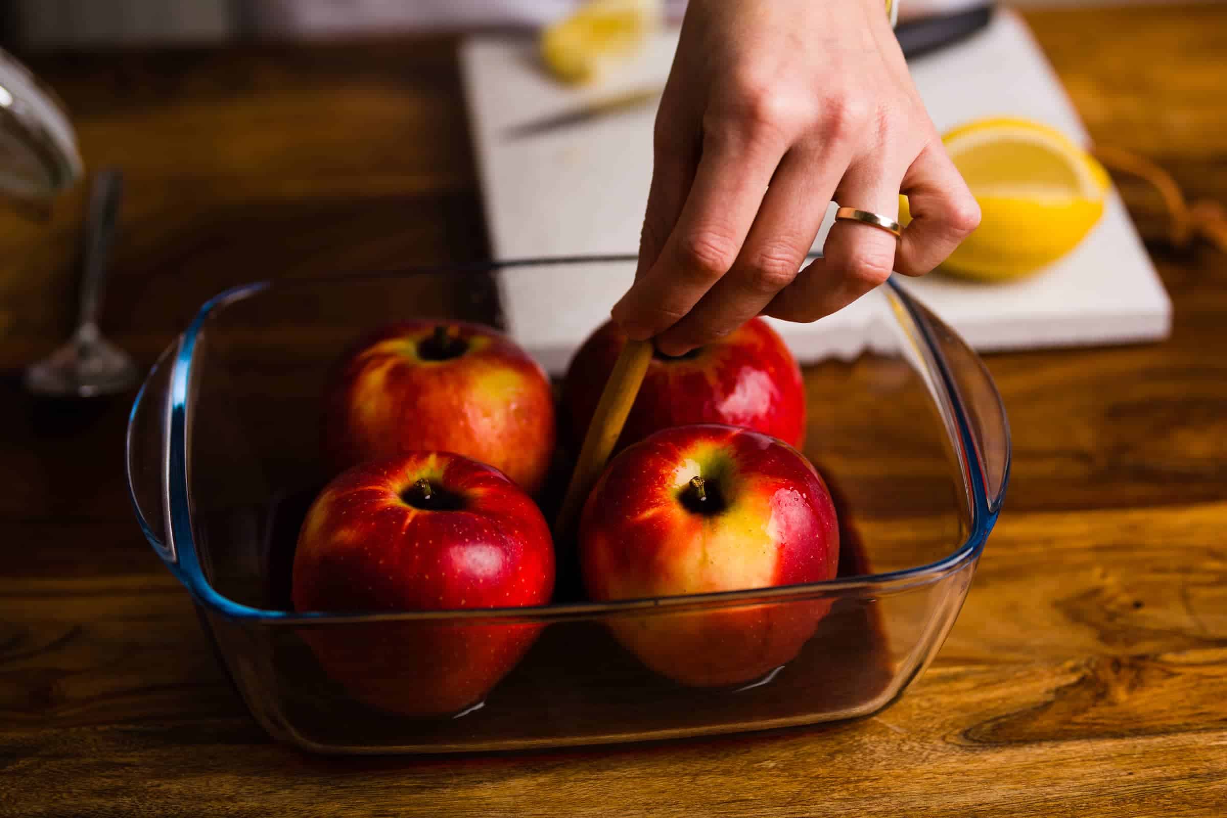 Adagiate le mele all’interno di una pirofila da forno e disponete uniformemente le stecche di cannella tra le mele.