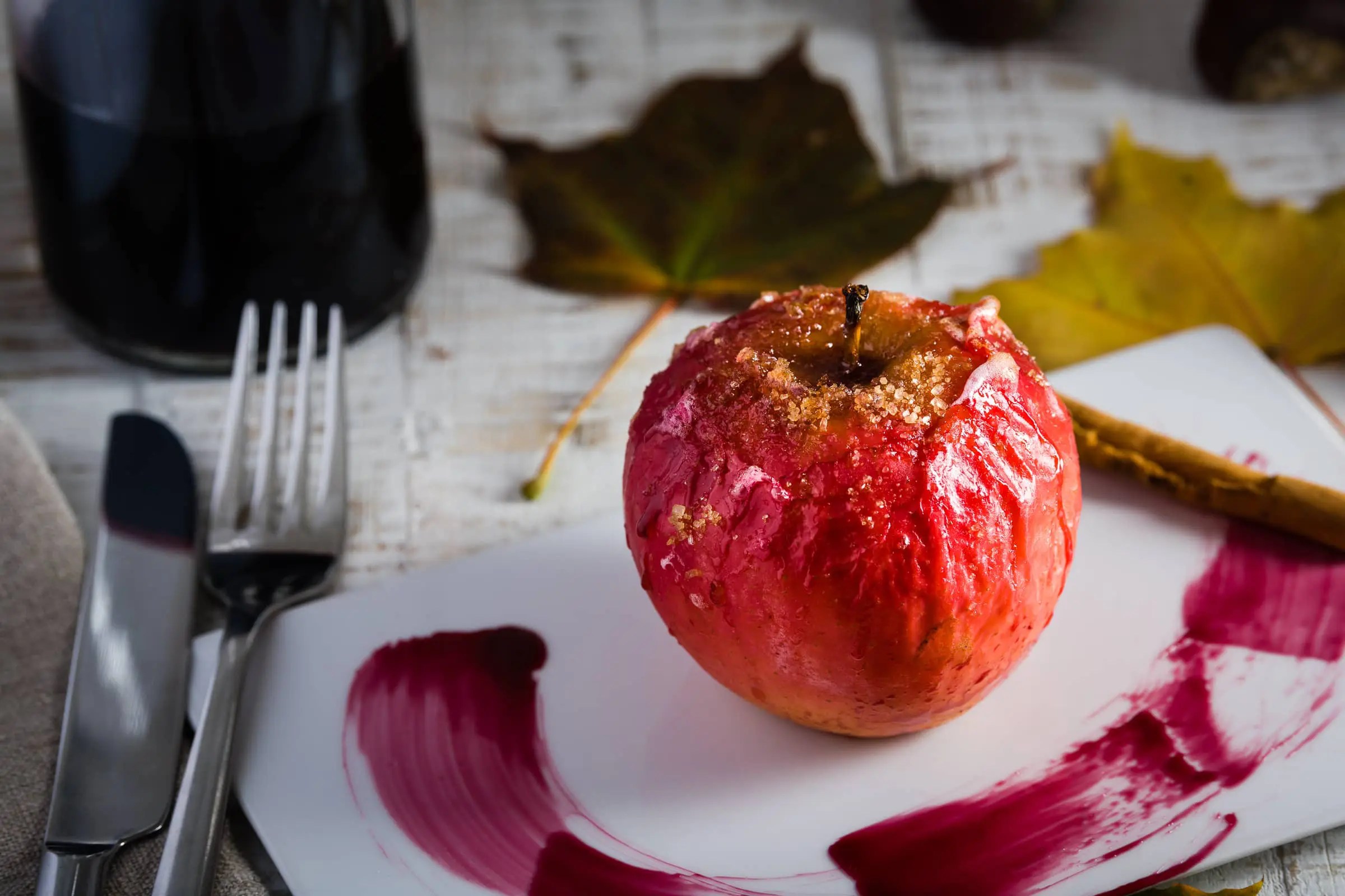 Le mele vanno gustate ancora calde accompagnate dallo sciroppo di vino prodotto in cottura.