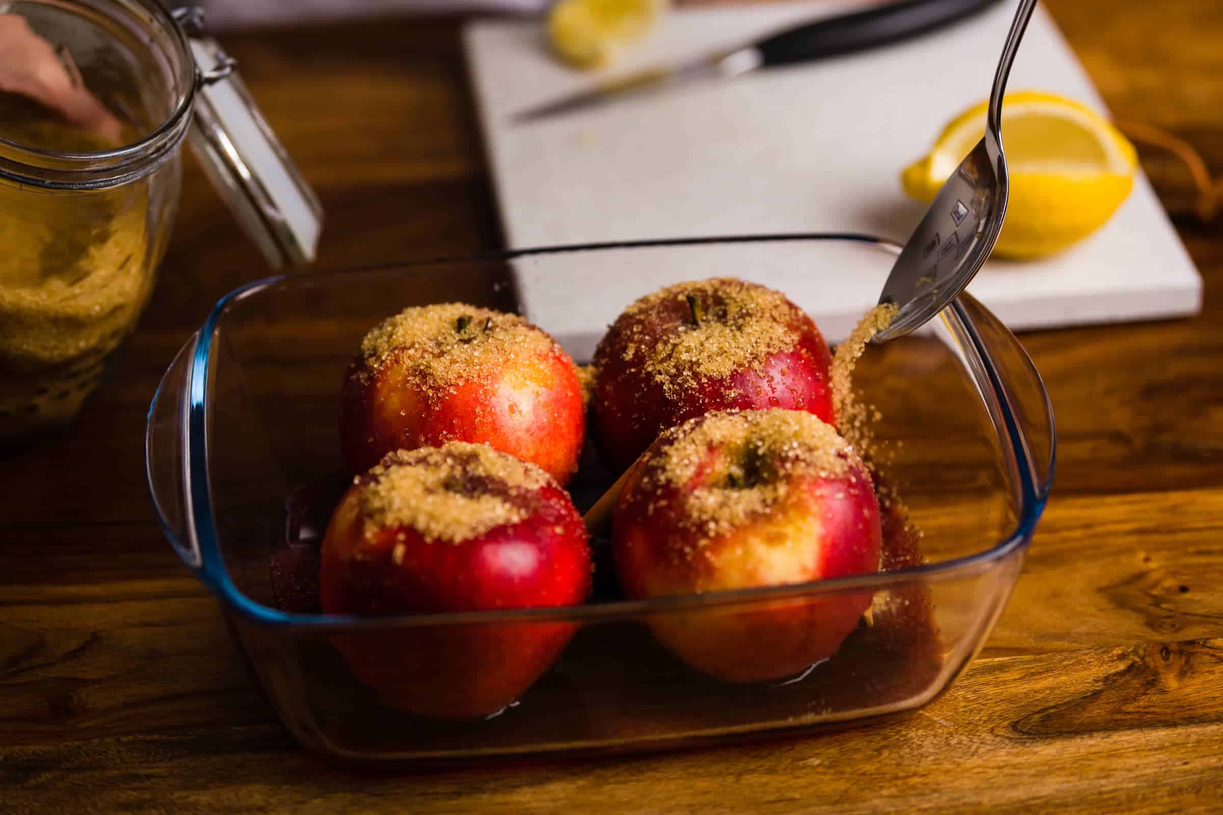 Cospargete ogni mela con lo zucchero di canna.