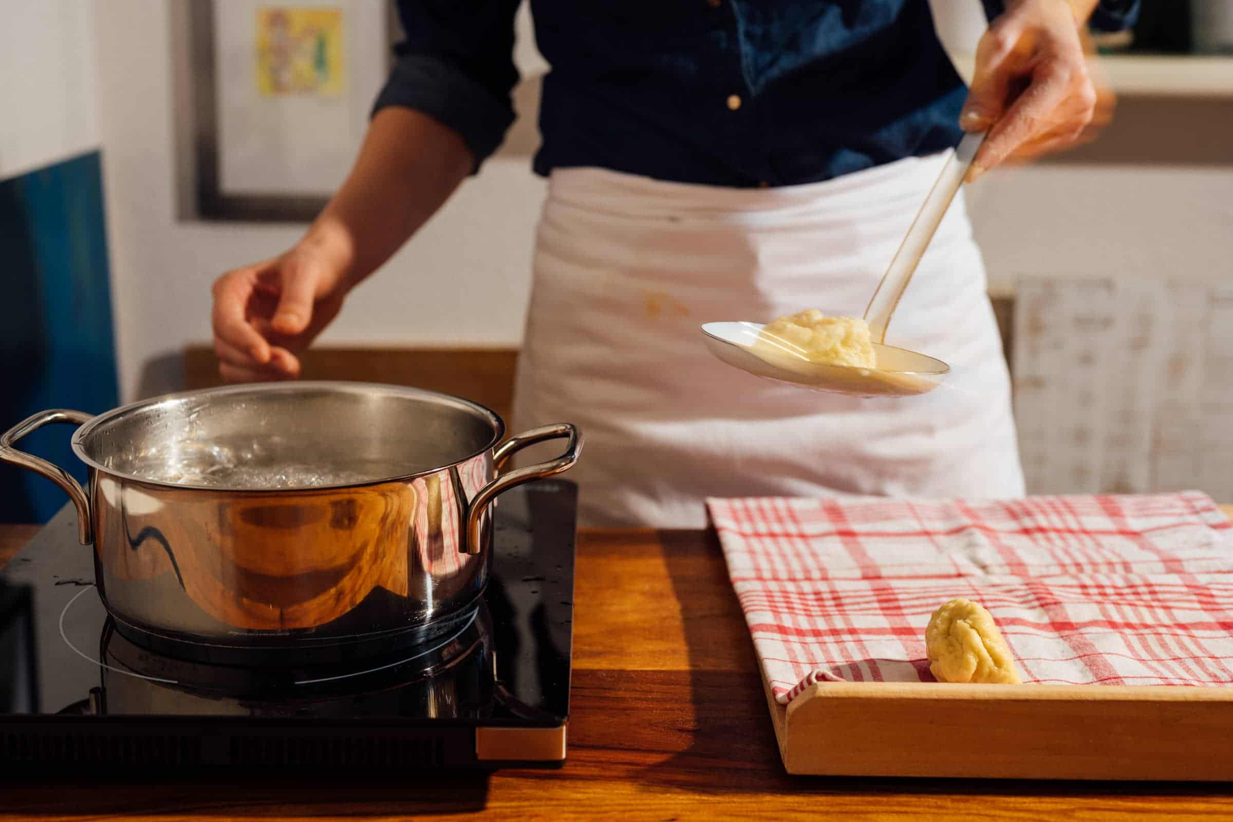 Lessate le palline un paio di minuti in acqua bollente, facendo attenzione a non farle attaccare sul fondo. Raccogliete le palline con l’aiuto di un schiumarola e adagiatele su di uno strofinaccio pulito.