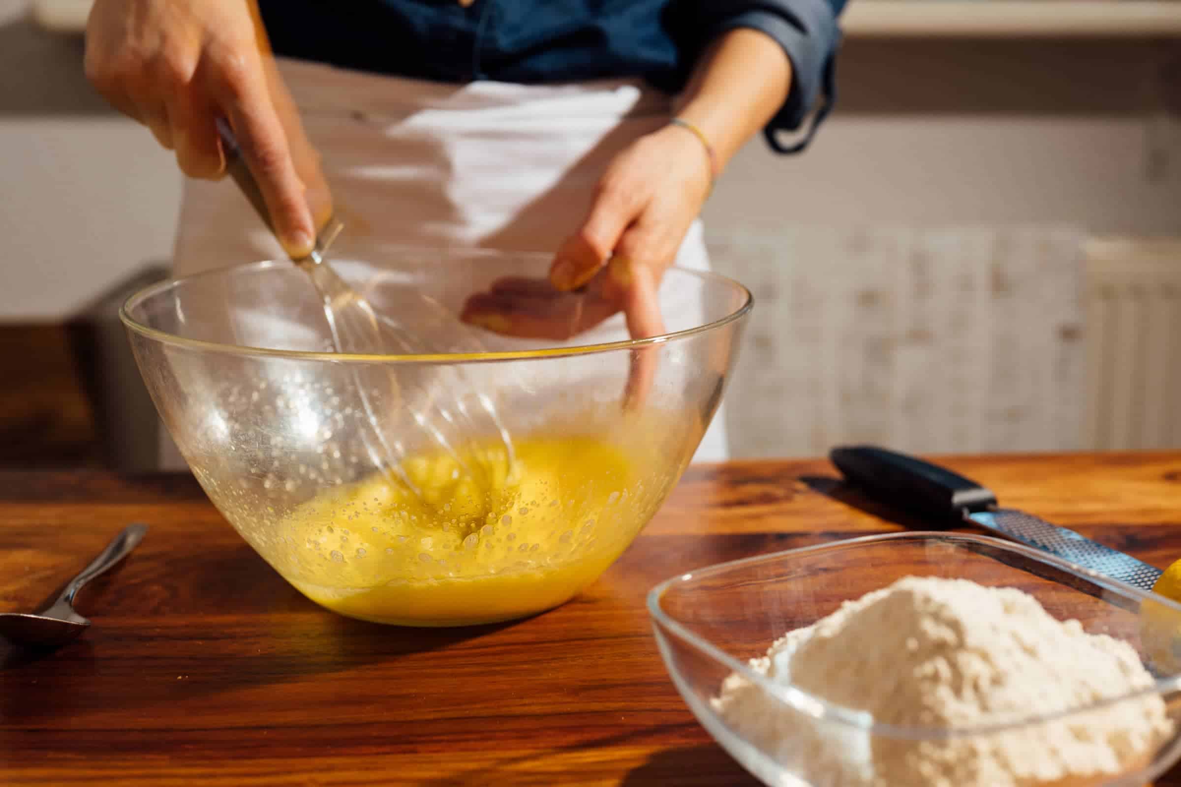 Battete le uova con lo zucchero all’interno di una ciotola, fino ad ad ottenere un composto leggero e spumoso.