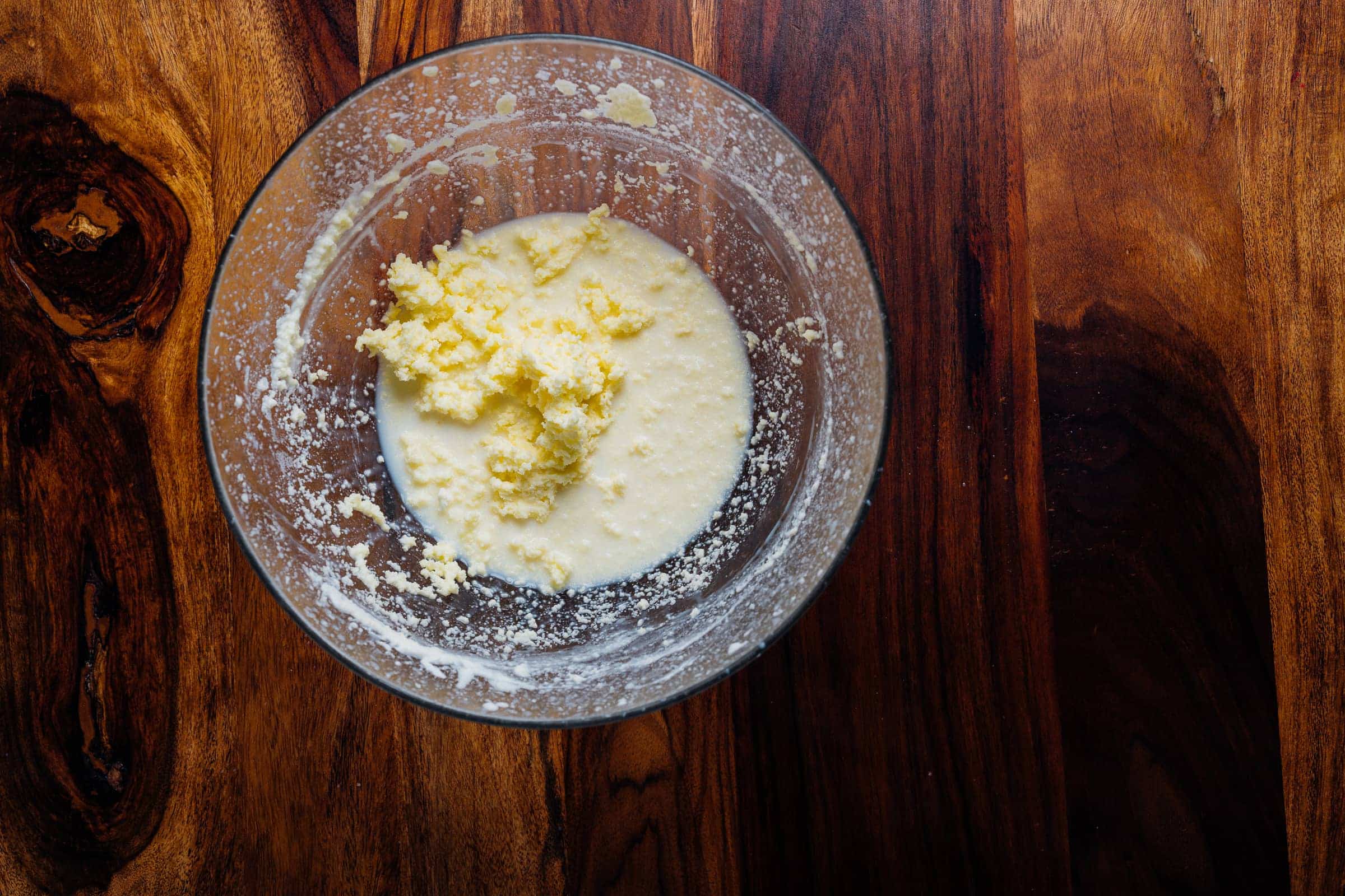 Lavorate il burro con una forchetta esercitando una leggera pressione per far fuoriuscire del tutto il latticello. Alla fine appoggiatelo su un telo sottile o un fazzoletto e strizzate.